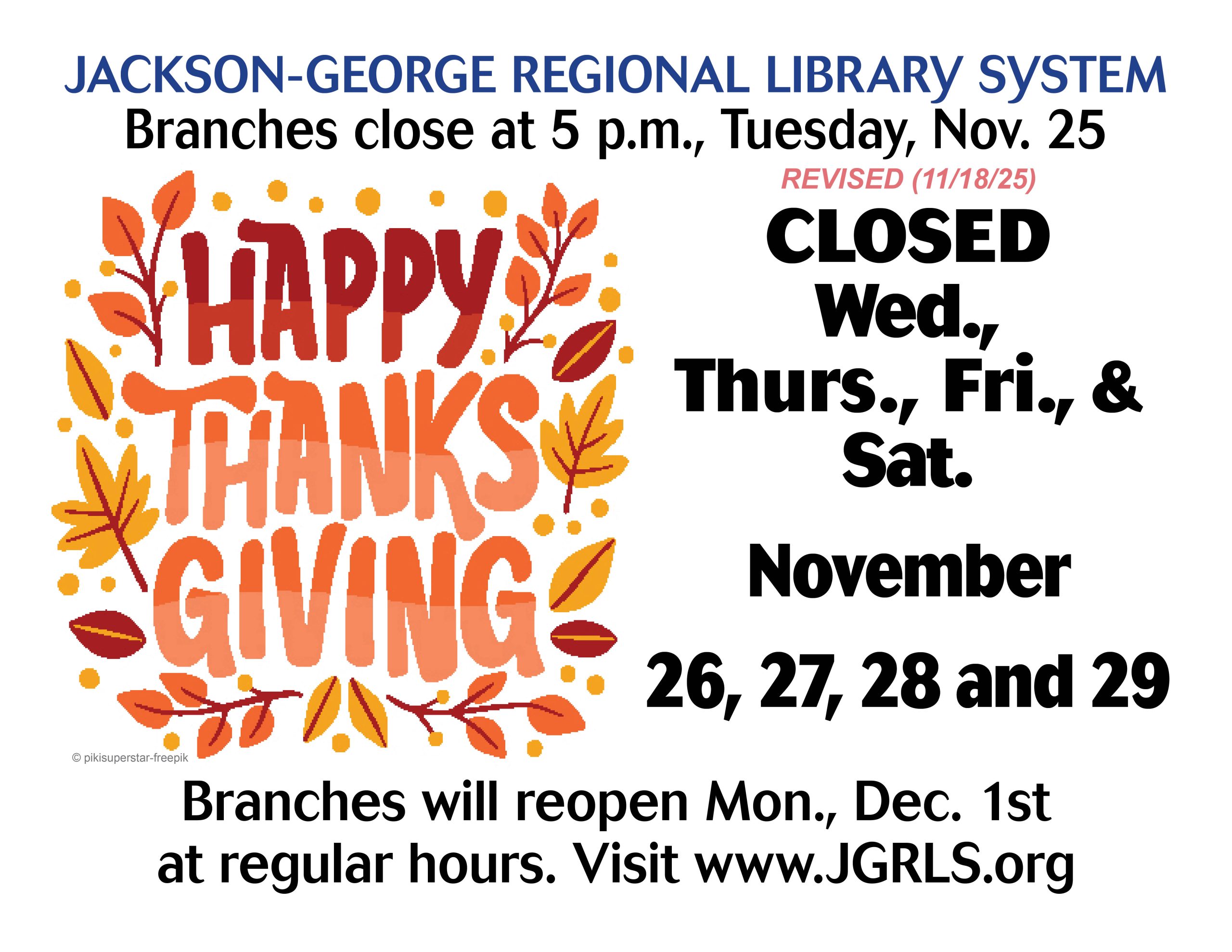Welcome to the Jackson-George Regional Library System, where inspiring ideas, enriching lives, and building communities is our passion. Discover a world of knowledge and imagination at our various locations. Join us for exciting events that cater to all ages and interests.