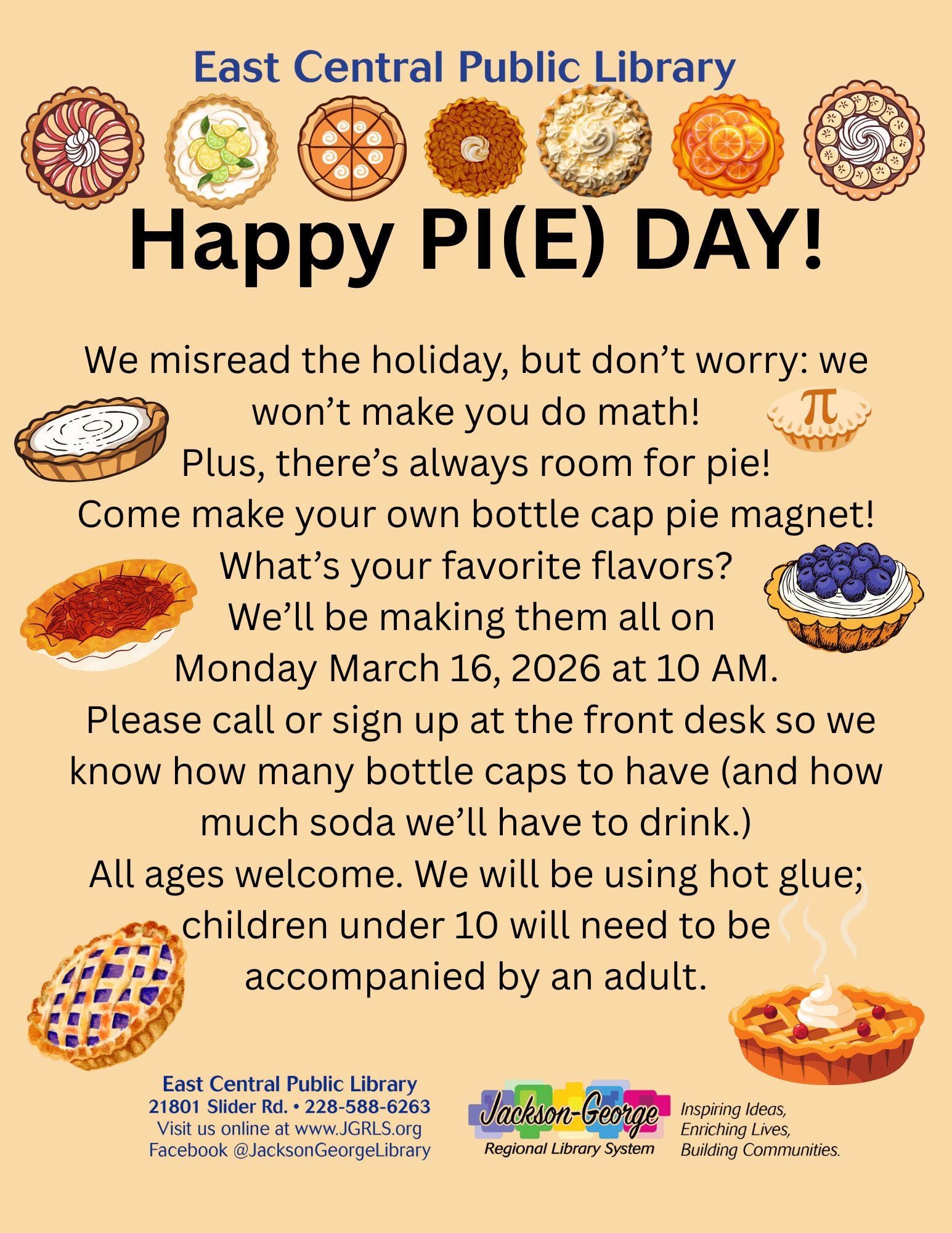 Join us on Monday, March 16, 2026, at 10:00 AM to create your very own bottle cap pie magnet, no math required! “We may have misread the holiday,” library staff shared, “but there’s always room for pie!” 🥧