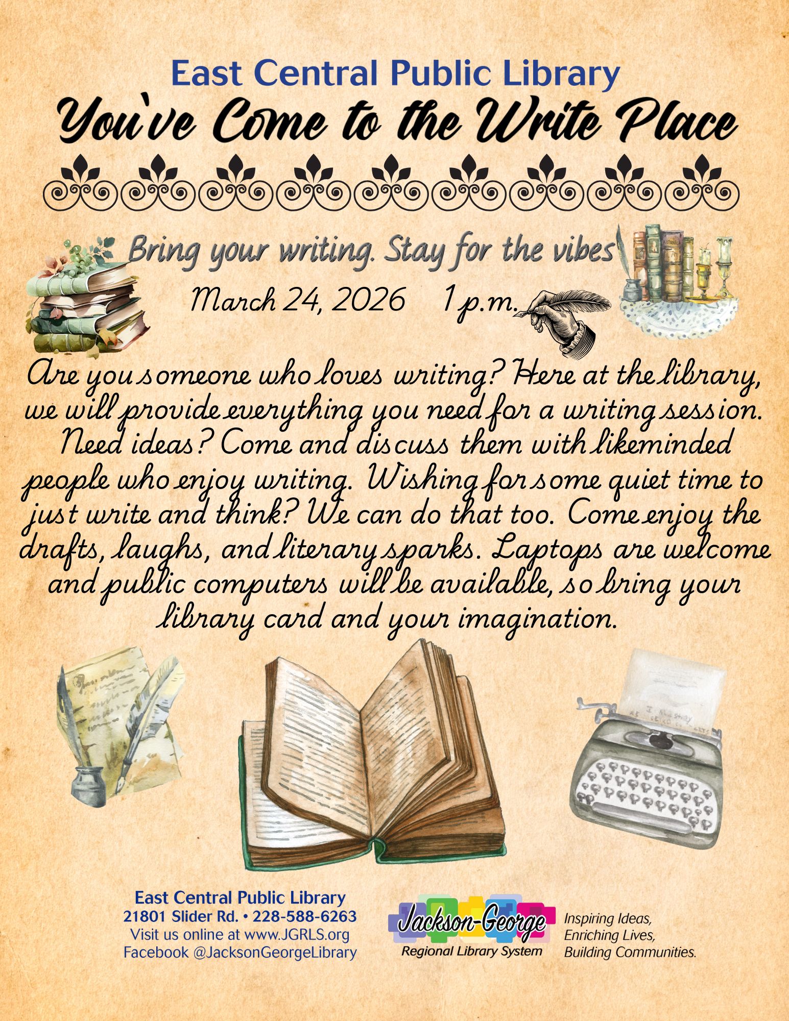 Hurley, MS – Writers, dreamers, and storytellers are invited to East Central Public Library for “You’ve Come to the Write Place” on March 24, 2026, at 1:00 p.m.