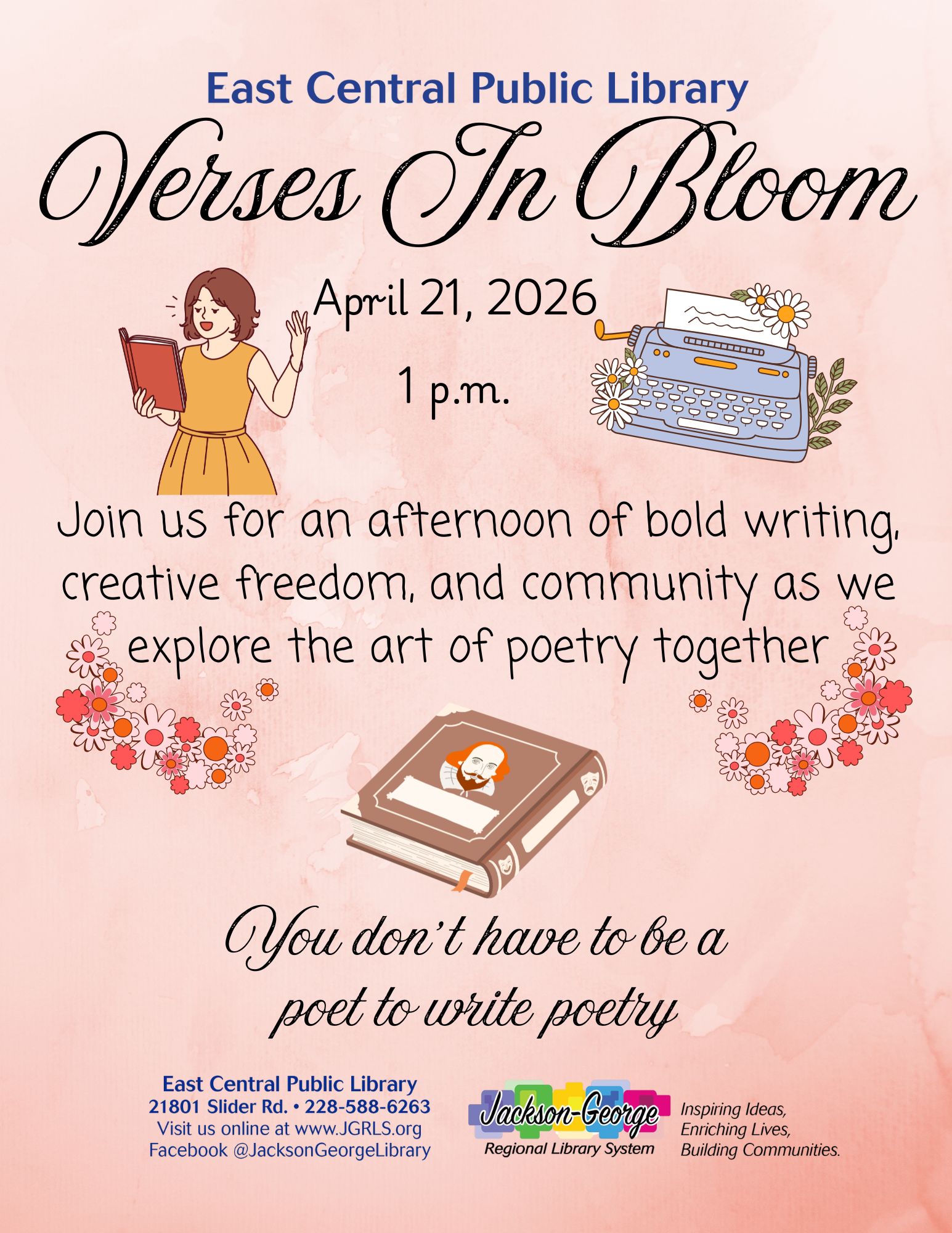 Pascagoula, MS — The East Central Public Library will host “Verses in Bloom,” a welcoming poetry gathering on Tuesday, April 21, 2026, at 1 p.m. at the library, located at 21801 Slider Road. This relaxed afternoon event celebrates the beauty of poetry and creative expression. Participants will explore writing prompts, share ideas, and enjoy a supportive atmosphere where creativity can flourish.