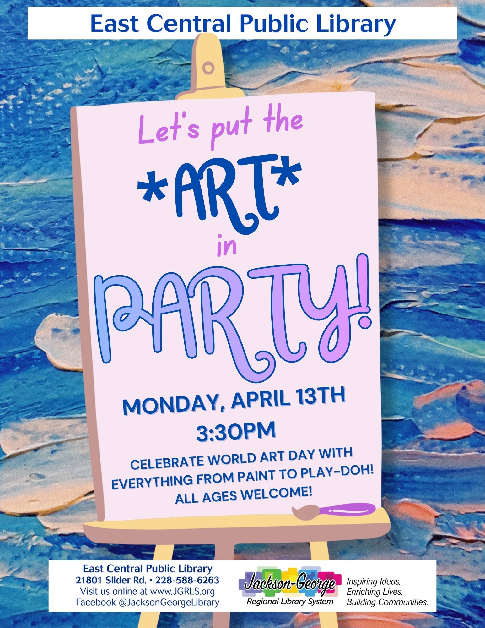 Pascagoula, MS — The East Central Public Library invites the community to get creative at its upcoming Art Party on Monday, April 13 at 3:30 p.m. at the library, located at 21801 Slider Road.