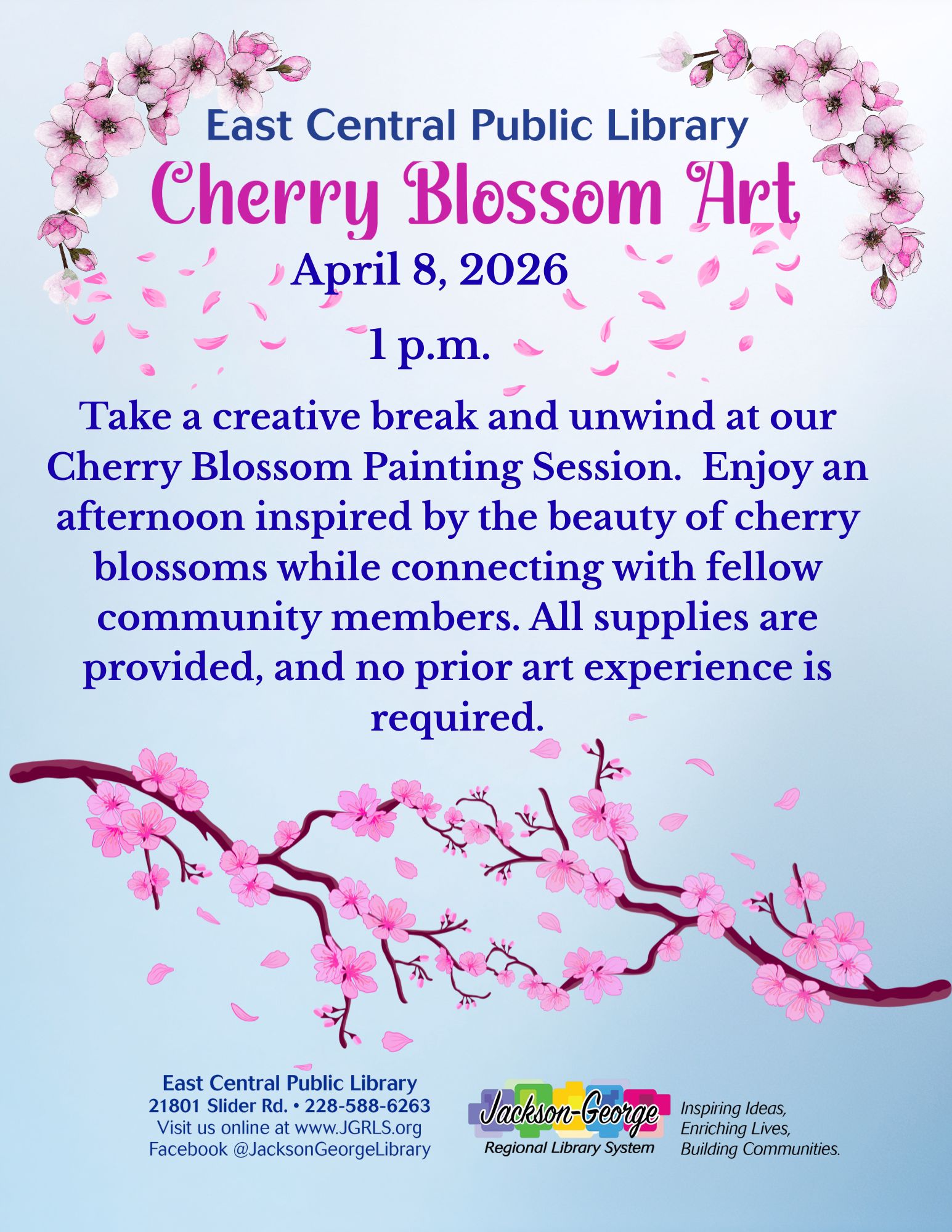 PASCAGOULA, MS — East Central Public Library will host a relaxing and creative Cherry Blossom Art Painting Session on Wednesday, April 8, 2026, at 1 p.m. Community members are invited to take a creative break and enjoy an afternoon inspired by the beauty of cherry blossoms. Participants will create their own cherry blossom artwork while connecting with fellow community members in a welcoming and fun environment.