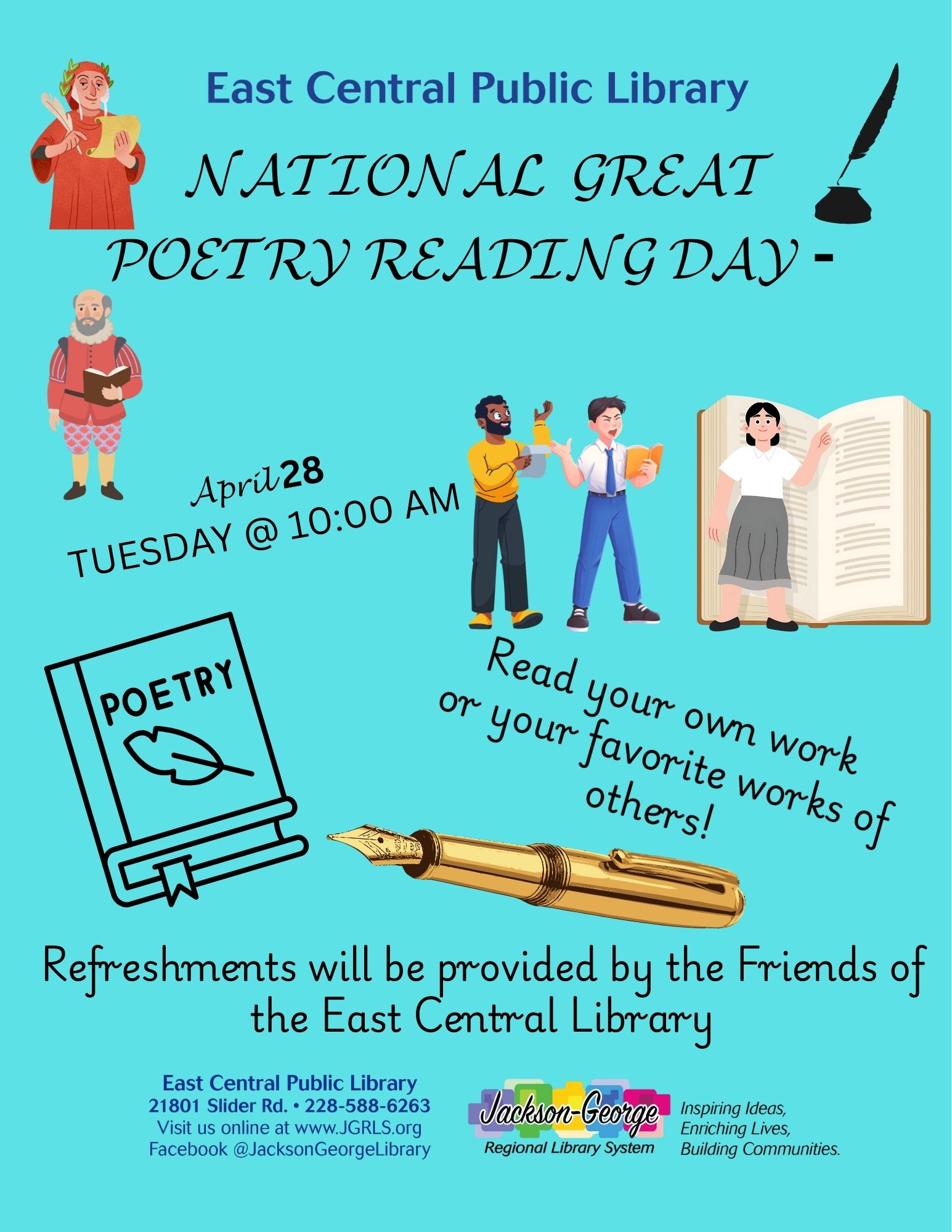 PASCAGOULA, MS — East Central Public Library invites community members to celebrate National Great Poetry Reading Day on Tuesday, April 28 at 10:00 a.m.