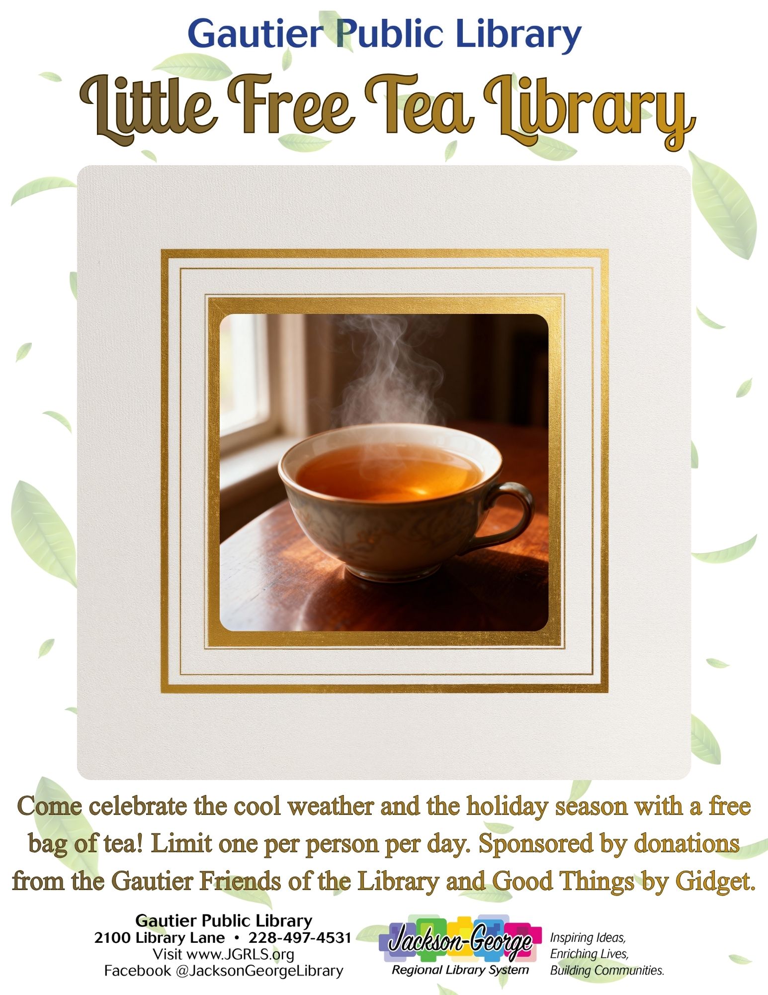 Gautier, MS – Gautier Public Library invites the community to enjoy a cozy seasonal treat through its Little Free Tea Library, offering free bags of tea to help celebrate the cool weather and holiday season.
