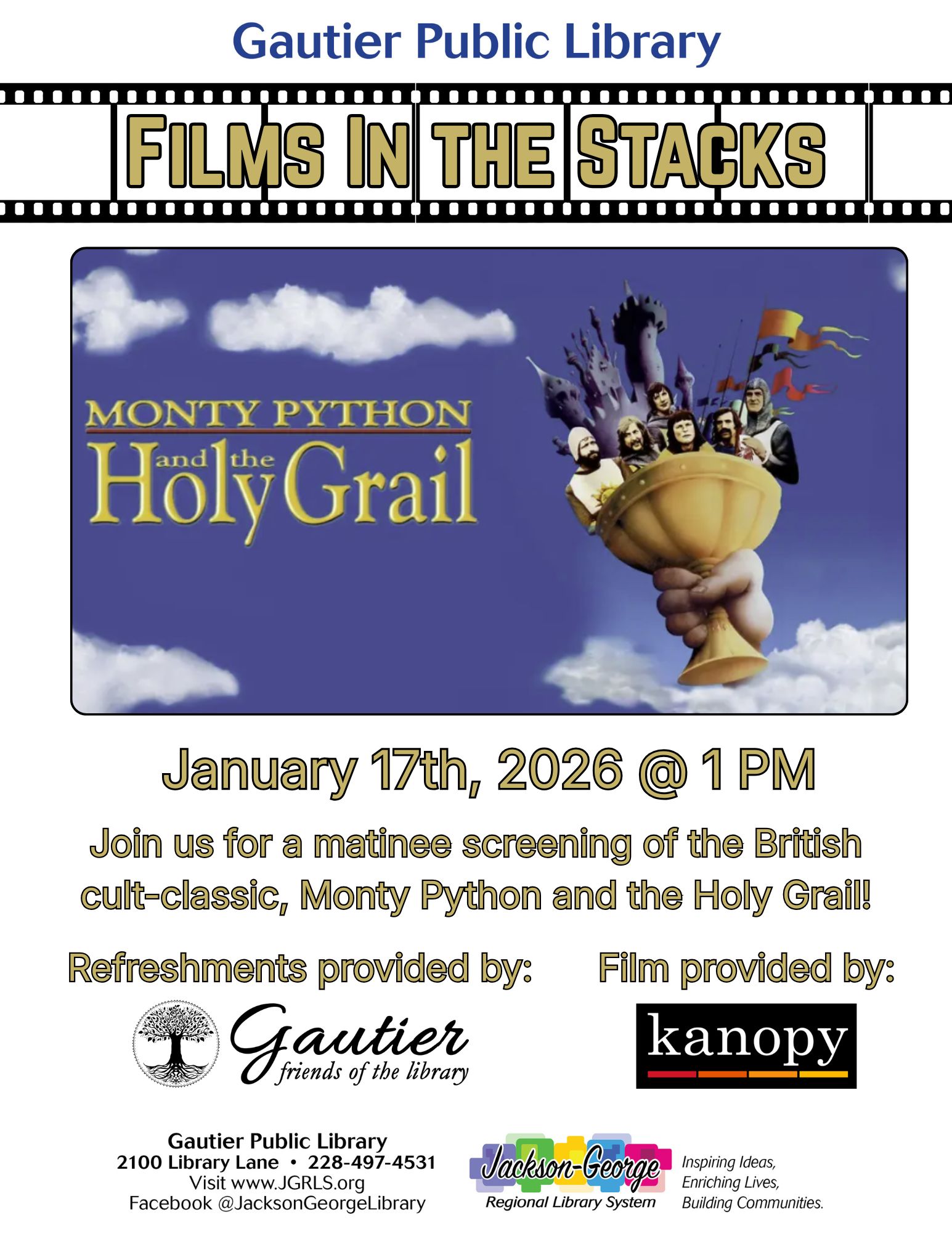 Gautier, MS – Gautier Public Library invites the community to enjoy a classic comedy during its Films in the Stacks program with a matinee screening of Monty Python and the Holy Grail on Saturday, January 17, 2026, at 1:00 p.m.