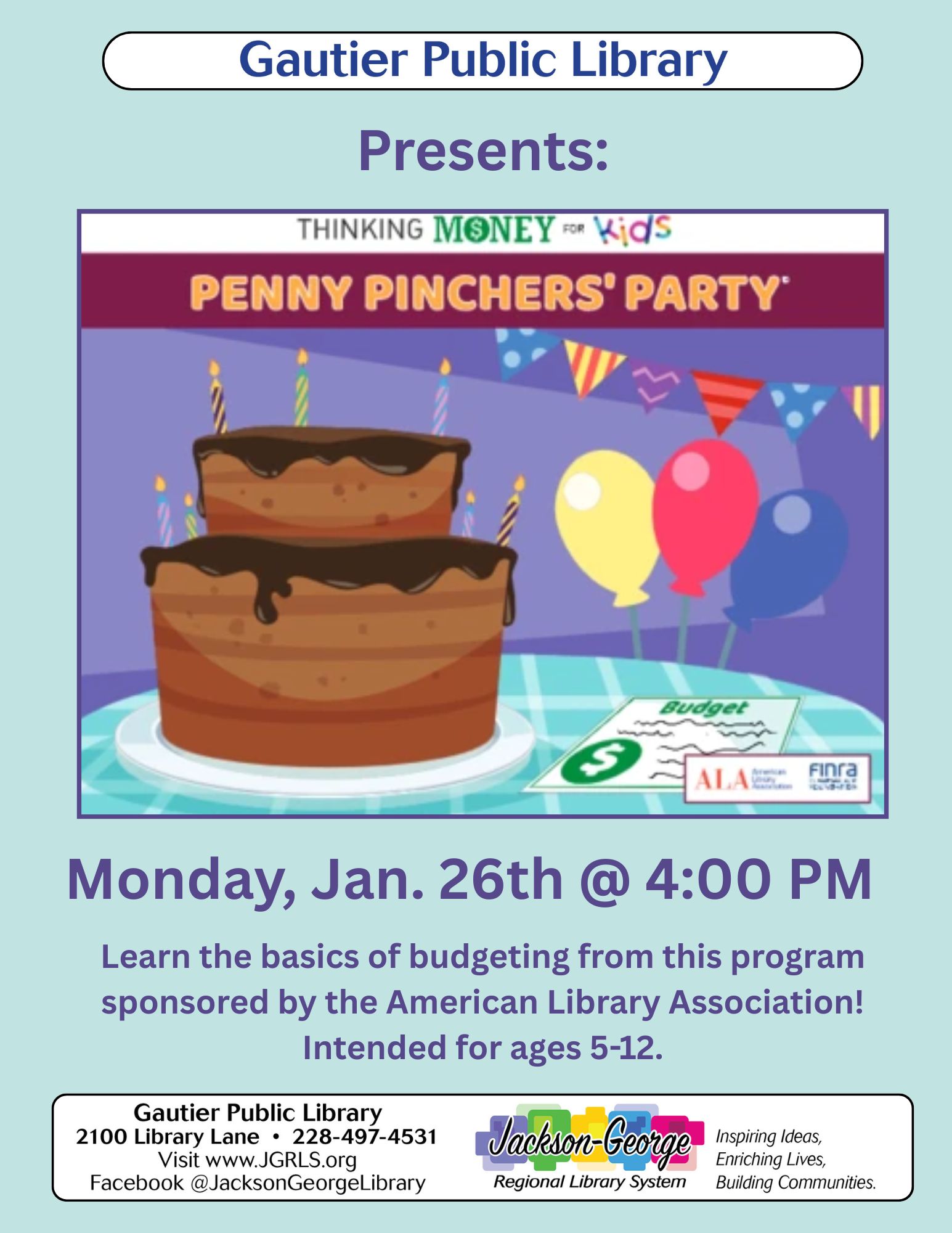 Gautier, MS — Gautier Public Library invites families to a fun and educational children’s program, “Penny Pinchers’ Party,” on Monday, January 26, at 4:00 p.m.