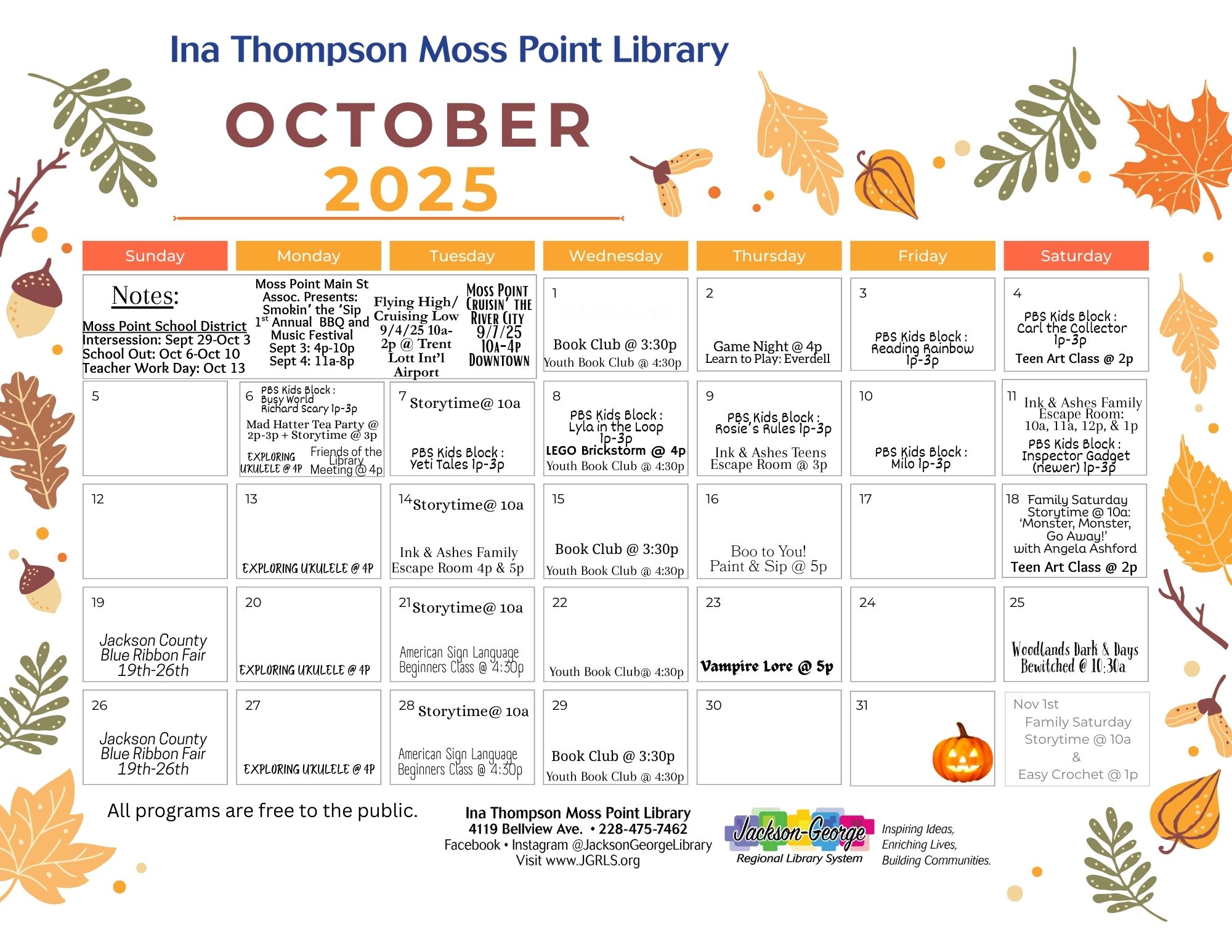 “The mission of the Jackson-George Regional Library System (JGRLS) is to provide high quality and relevant customer-oriented library and information services, collections of resources, and programming that serves to expand and enrich the lives of our citizens.”
