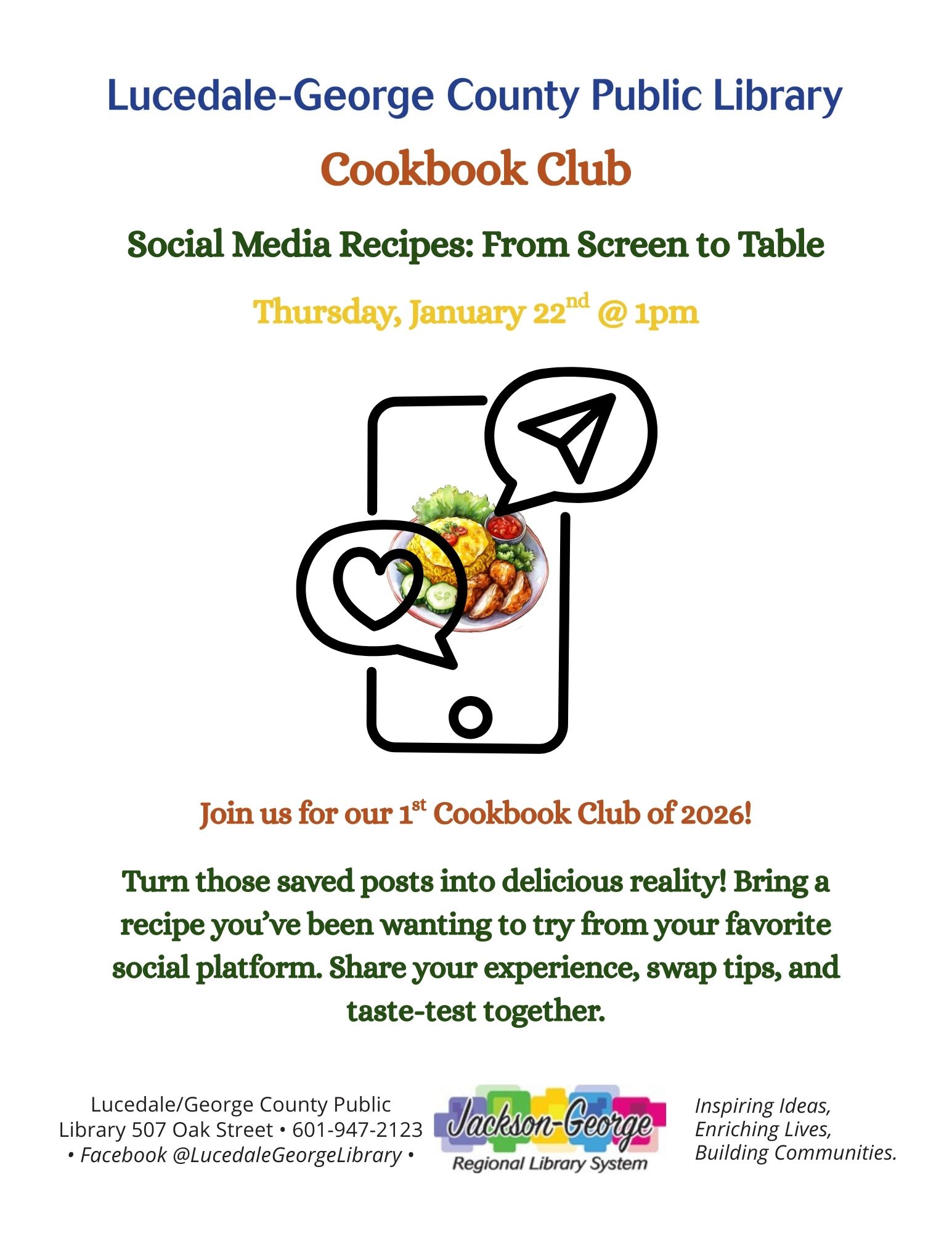 LUCEDALE, MS – Lucedale–George County Public Library invites the community to kick off the new year with its first Cookbook Club of 2026, Social Media Recipes: From Screen to Table, on Thursday, January 22, at 1:00 p.m.
