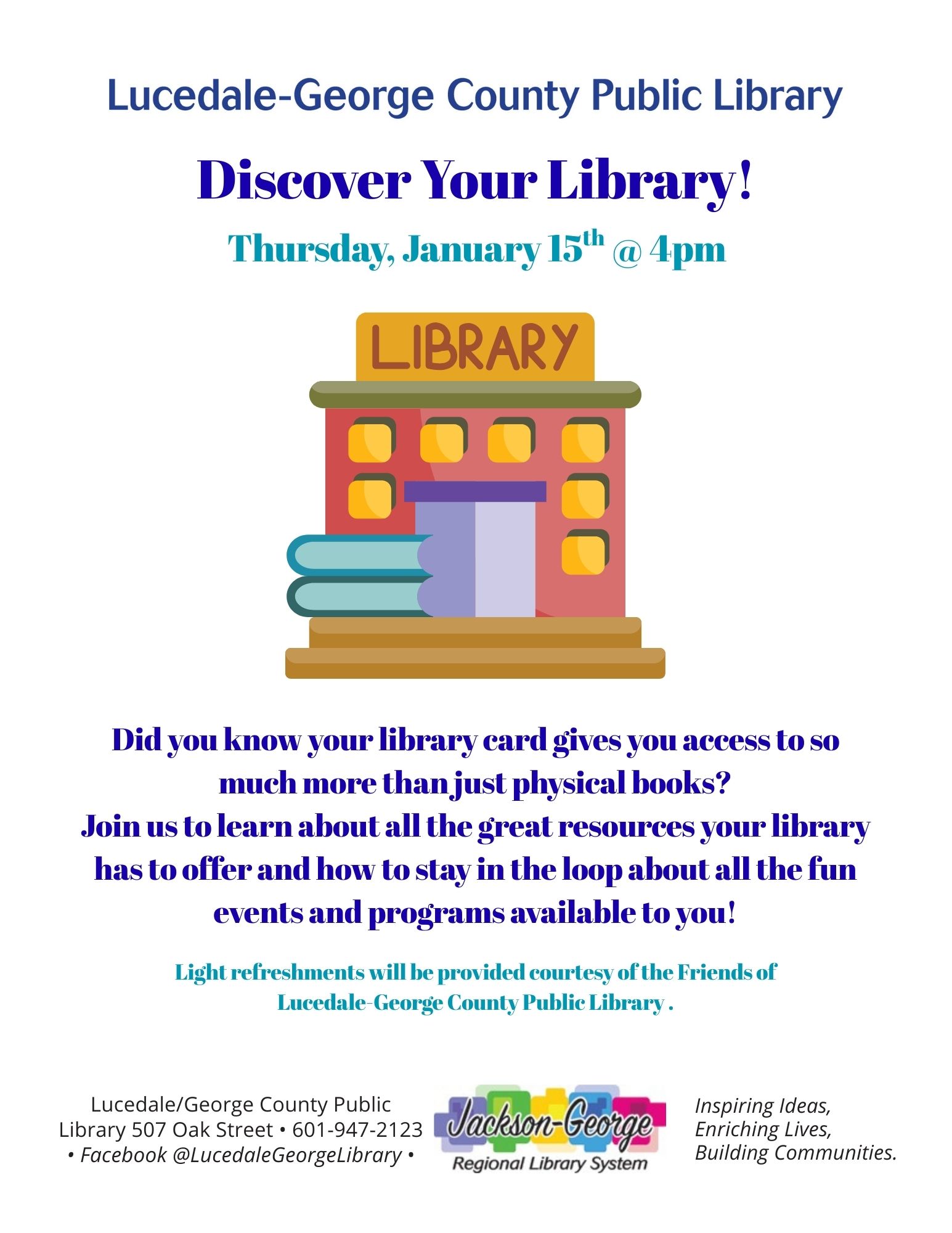 Lucedale–George County Public Library invites the community to learn more about everything the library has to offer during Discover Your Library, taking place on Thursday, January 15, at 4:00 p.m.