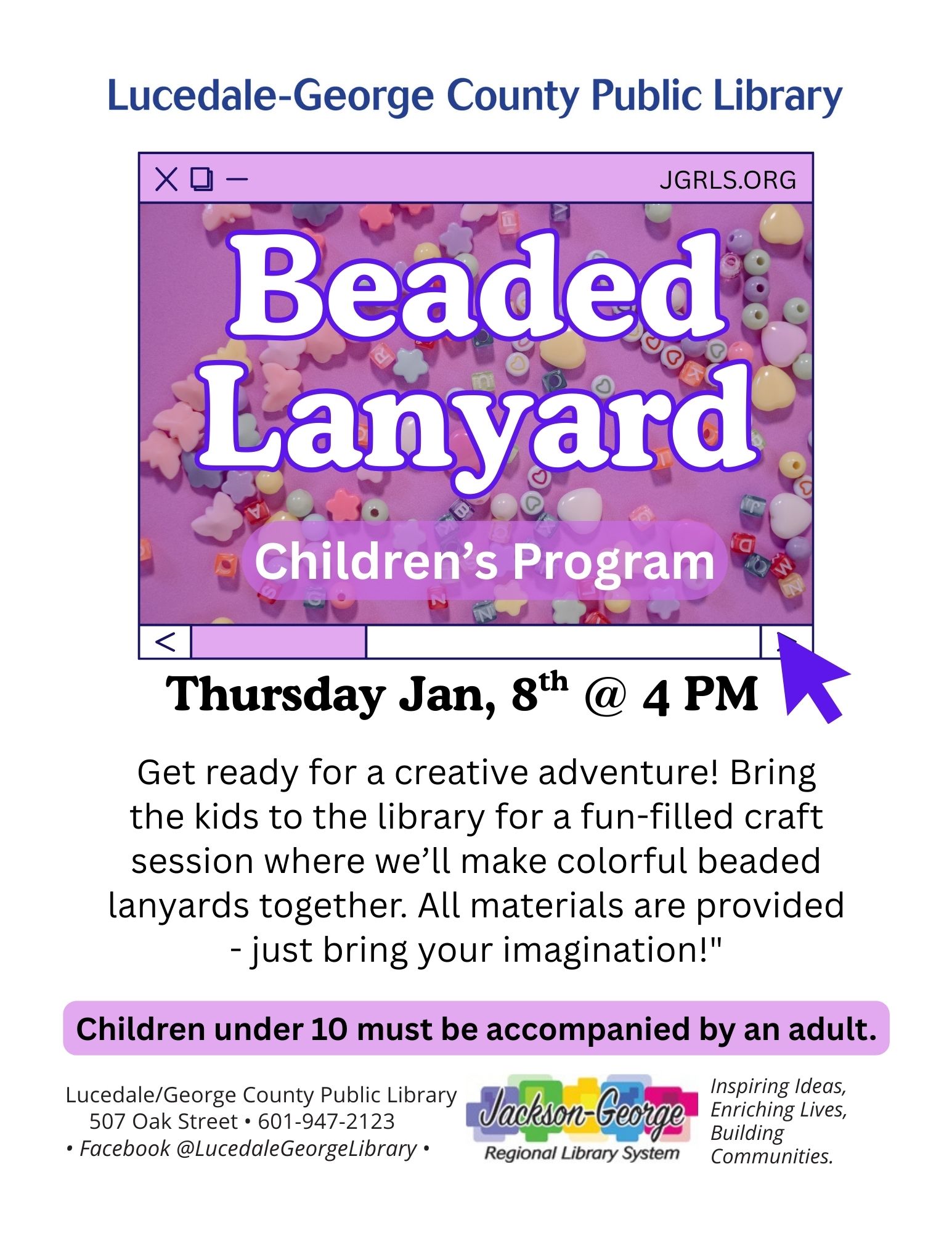 Lucedale–George County Public Library invites families to a fun and creative Beaded Lanyard Children’s Program on Thursday, January 8, at 4:00 p.m.