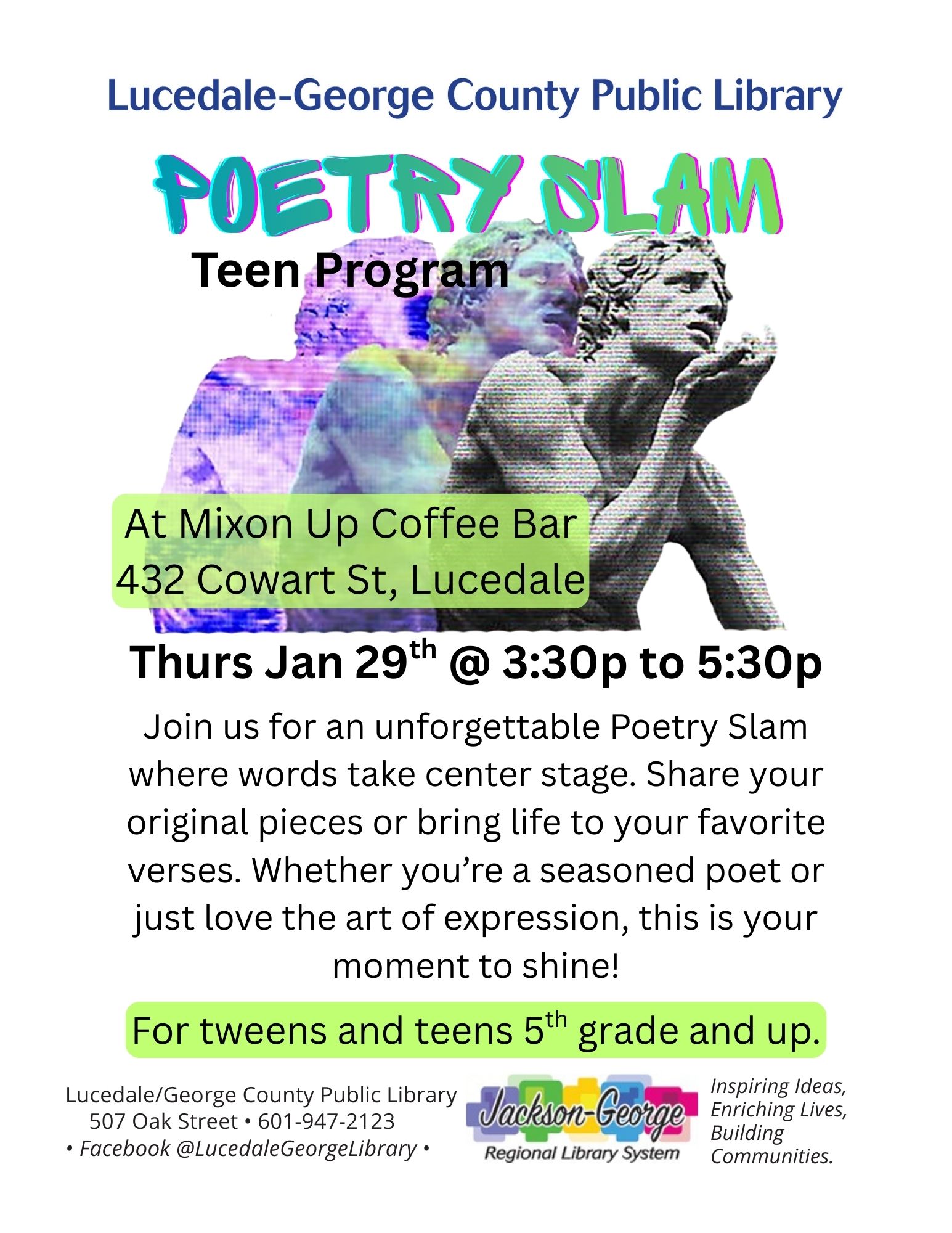 LUCEDALE, MS – Lucedale–George County Public Library invites tweens and teens to take the stage at a Poetry Slam Teen Program on Thursday, January 29, from 3:30 to 5:30 p.m., hosted at Mixon Up Coffee Bar, located at 432 Cowart Street in Lucedale.