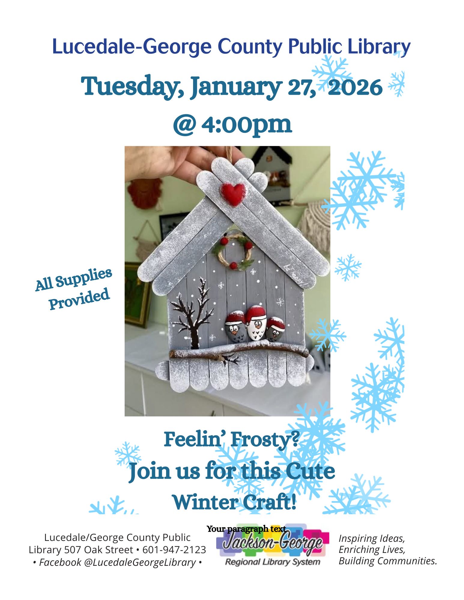 LUCEDALE, MS – Lucedale–George County Public Library invites the community to warm up with a creative winter craft on Tuesday, January 27, 2026, at 4:00 p.m.