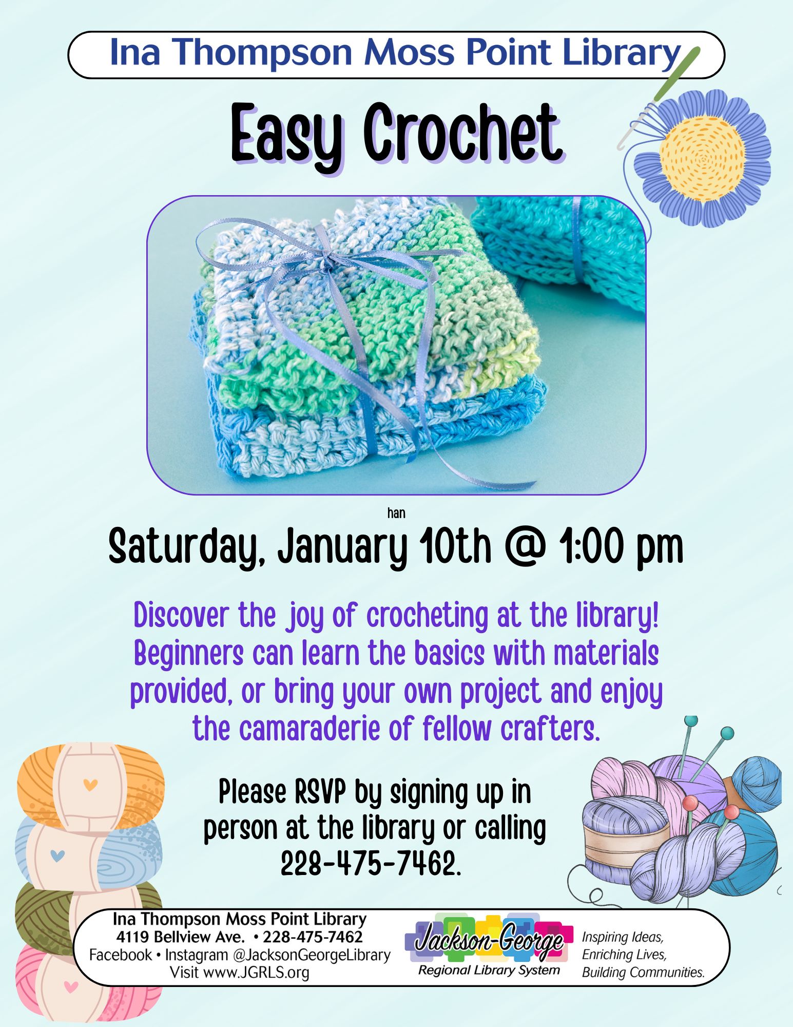 Ina Thompson Moss Point Library invites the community to unwind and get creative during an Easy Crochet workshop on Saturday, January 10, at 1:00 p.m.
