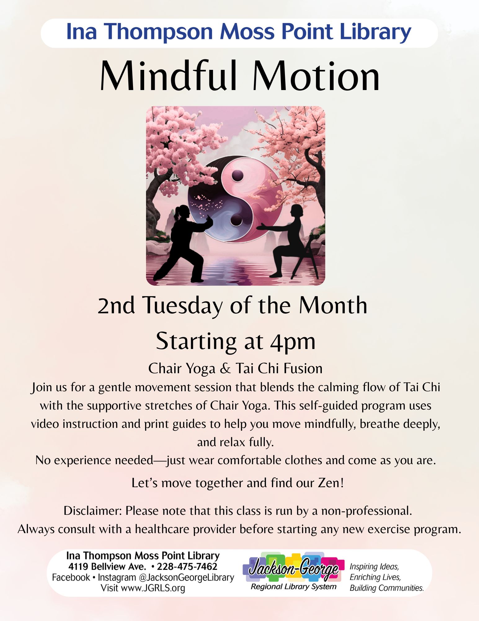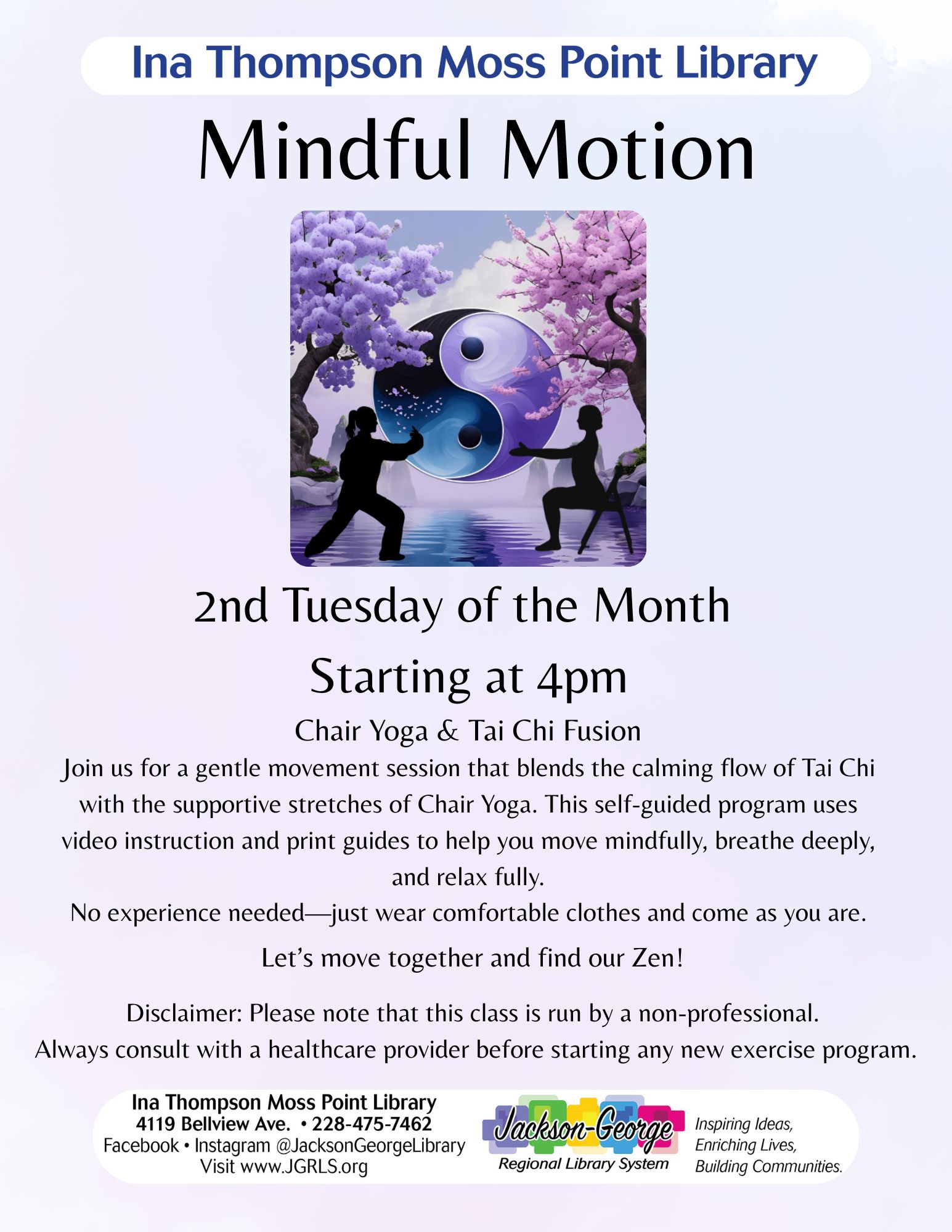 Ina Thompson Moss Point Library invites the community to slow down and reconnect through Mindful Motion, a gentle movement program held on the second Tuesday of each month, beginning at 4:00 p.m.