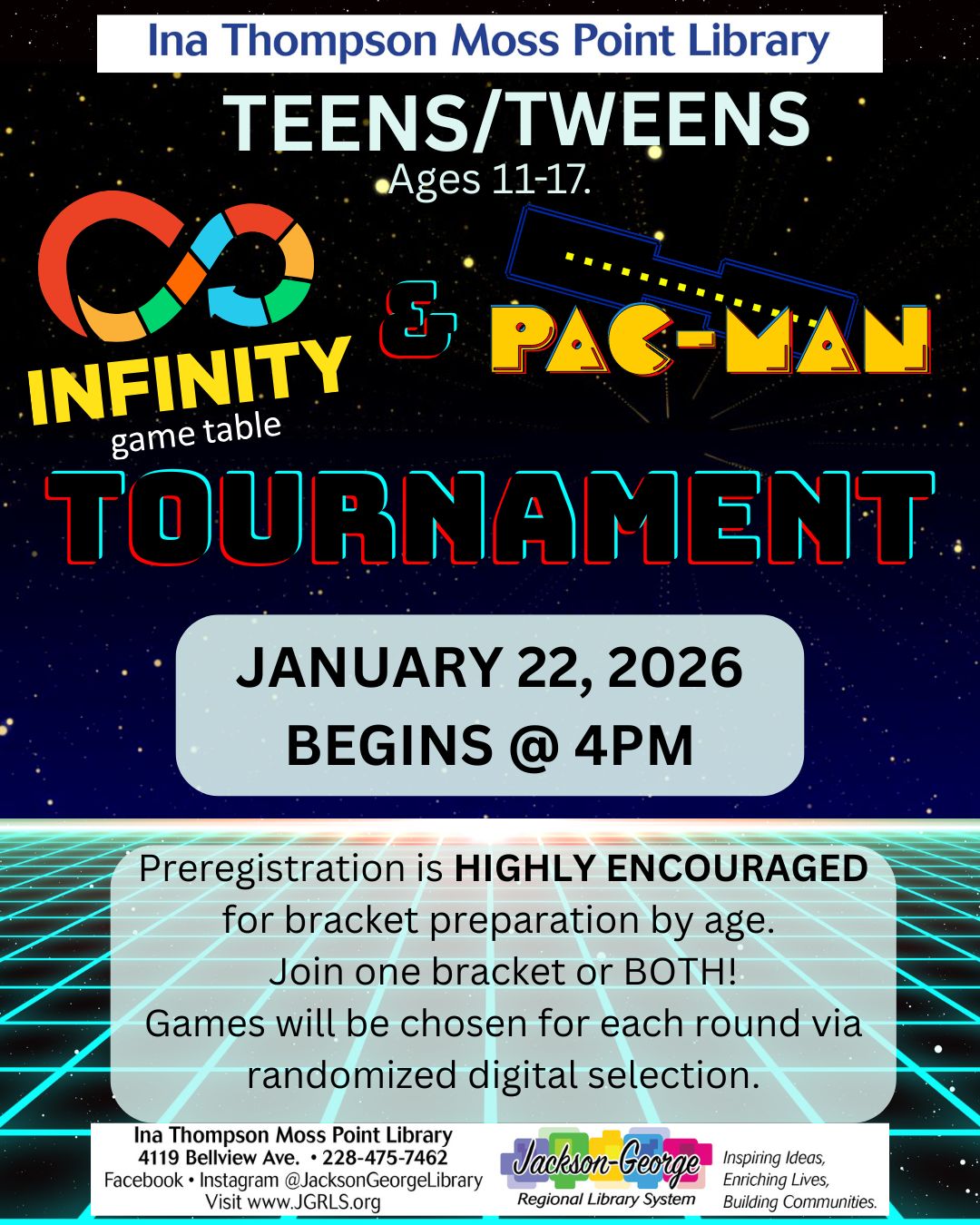 Ina Thompson Moss Point Library invites teens and tweens ages 11–17 to level up at an Infinity Game Table & Pac-Man Tournament on Thursday, January 22, 2026, beginning at 4:00 p.m.