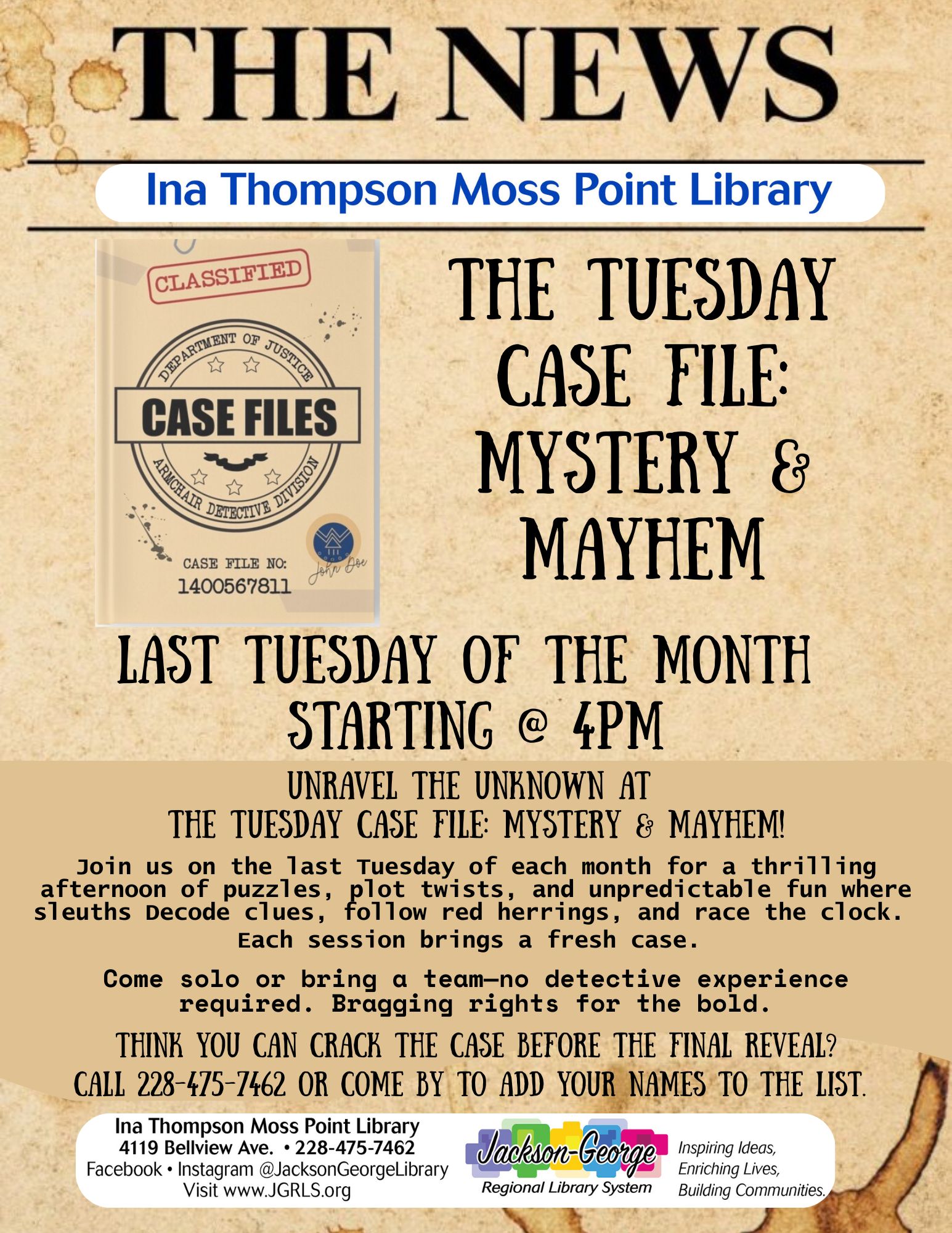 Mystery lovers are invited to put their detective skills to the test at The Tuesday Case File: Mystery & Mayhem, a new recurring program at the Ina Thompson Moss Point Library. Beginning this month, the program will be held on the last Tuesday of each month starting at 4:00 p.m.