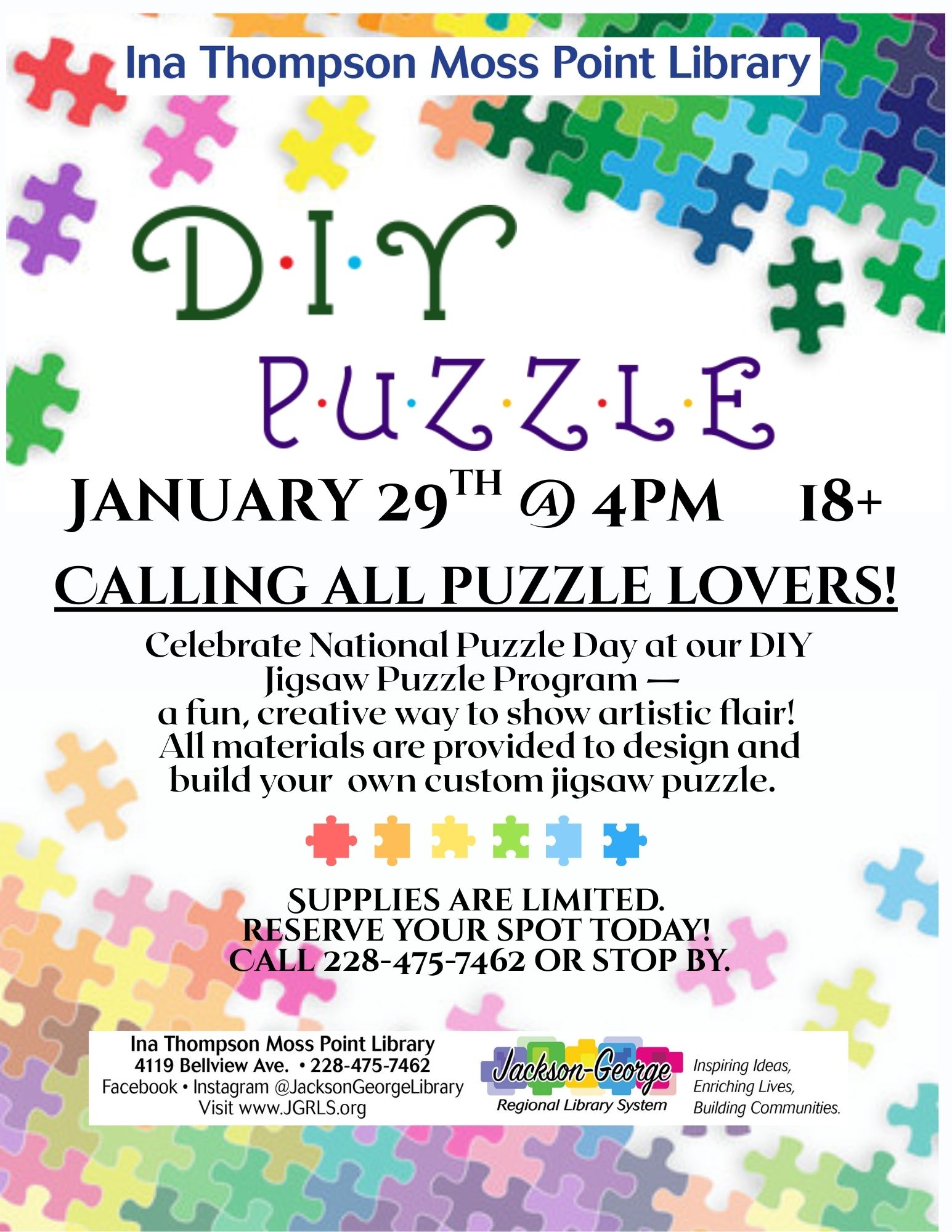 Ina Thompson Moss Point Library invites adults to celebrate National Puzzle Day with a creative twist during DIY Puzzle, taking place on Thursday, January 29, at 4:00 p.m.