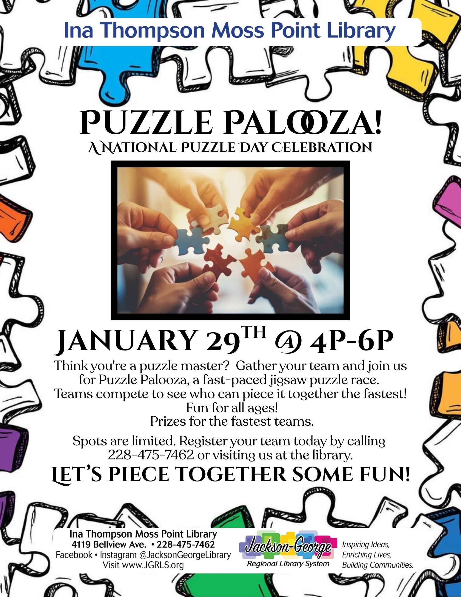 Ina Thompson Moss Point Library invites the community to put their problem-solving skills to the test at Puzzle Palooza!, a National Puzzle Day celebration, on Thursday, January 29, from 4:00 to 6:00 p.m.