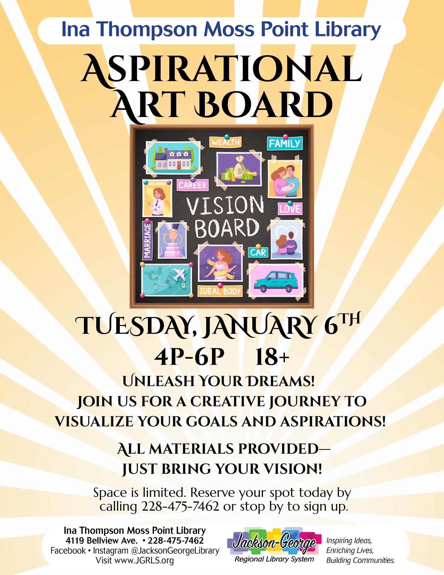 Ina Thompson Moss Point Library invites adults to kick off the new year with creativity and purpose during an Aspirational Art Board workshop on Tuesday, January 6, from 4:00 to 6:00 p.m.