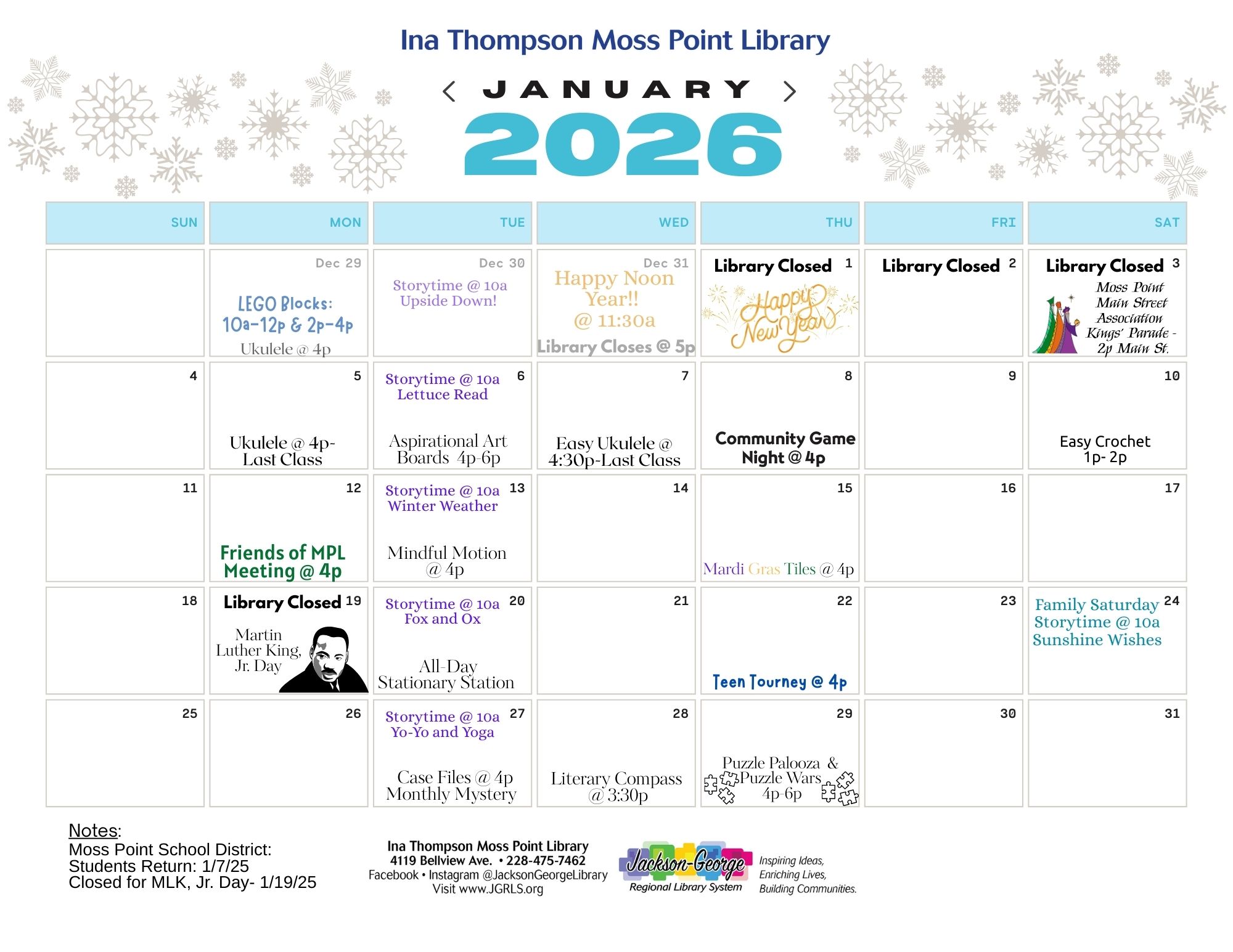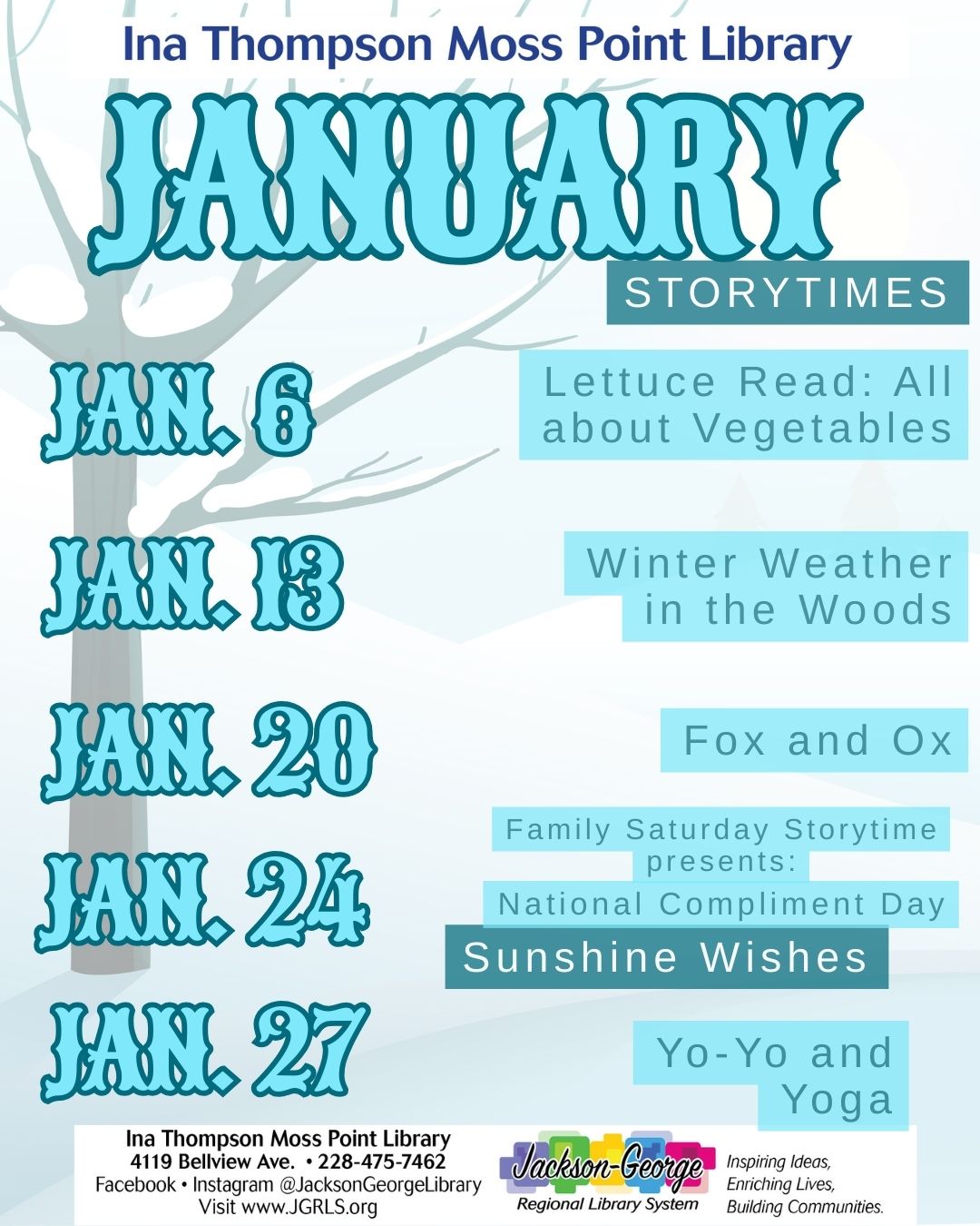 Moss Point, MS —Ina Thompson Moss Point Library invites families to enjoy a full month of engaging January Storytimes, featuring themed stories, activities, and special celebrations for young readers.