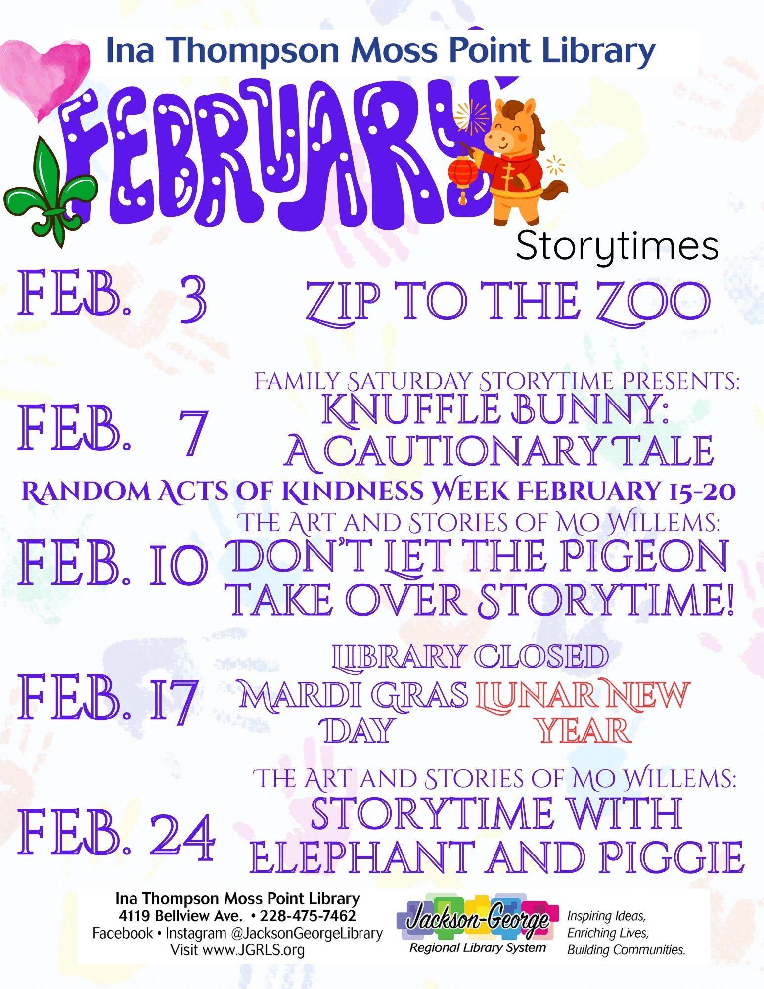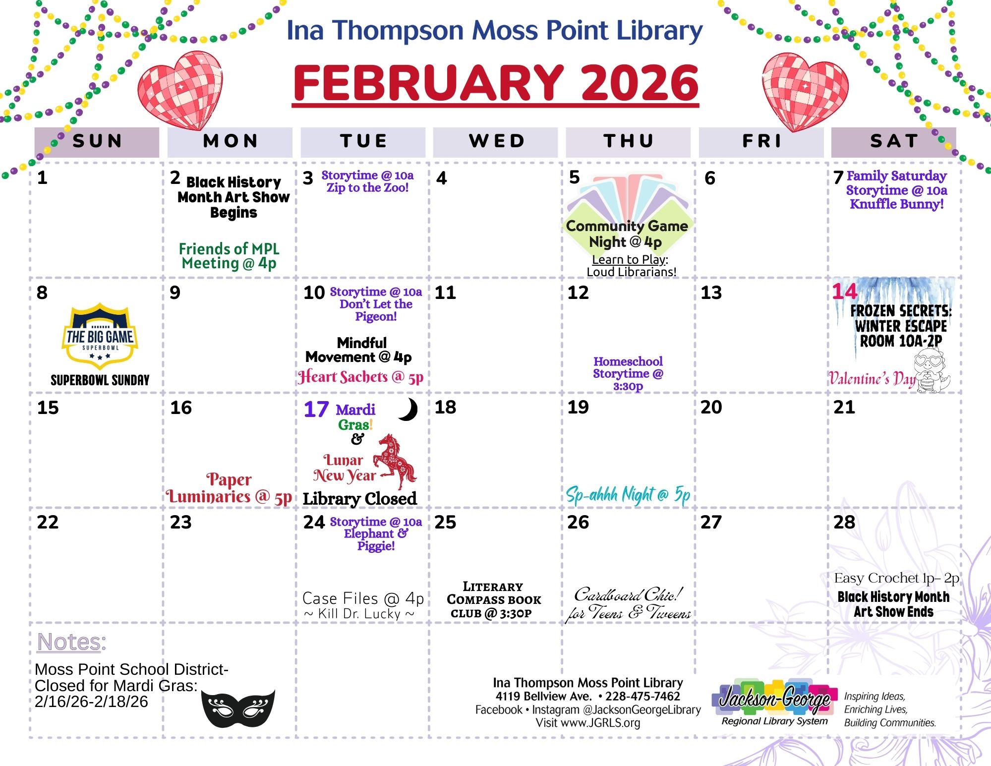 MOSS POINT, MS — Ina Thompson Moss Point Library invites families to enjoy a month full of fun, stories, and creativity with its February Storytimes lineup. Throughout the month, children and families can enjoy a variety of themed story times and special programs, including: