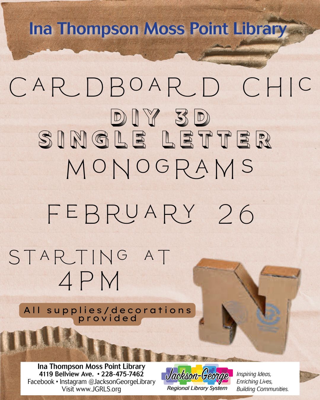 MOSS POINT, MS — Thompson Moss Point Library invites the community to get creative with Cardboard Chic: DIY 3D Single Letter Monograms on Wednesday, February 26, at 4:00 p.m.