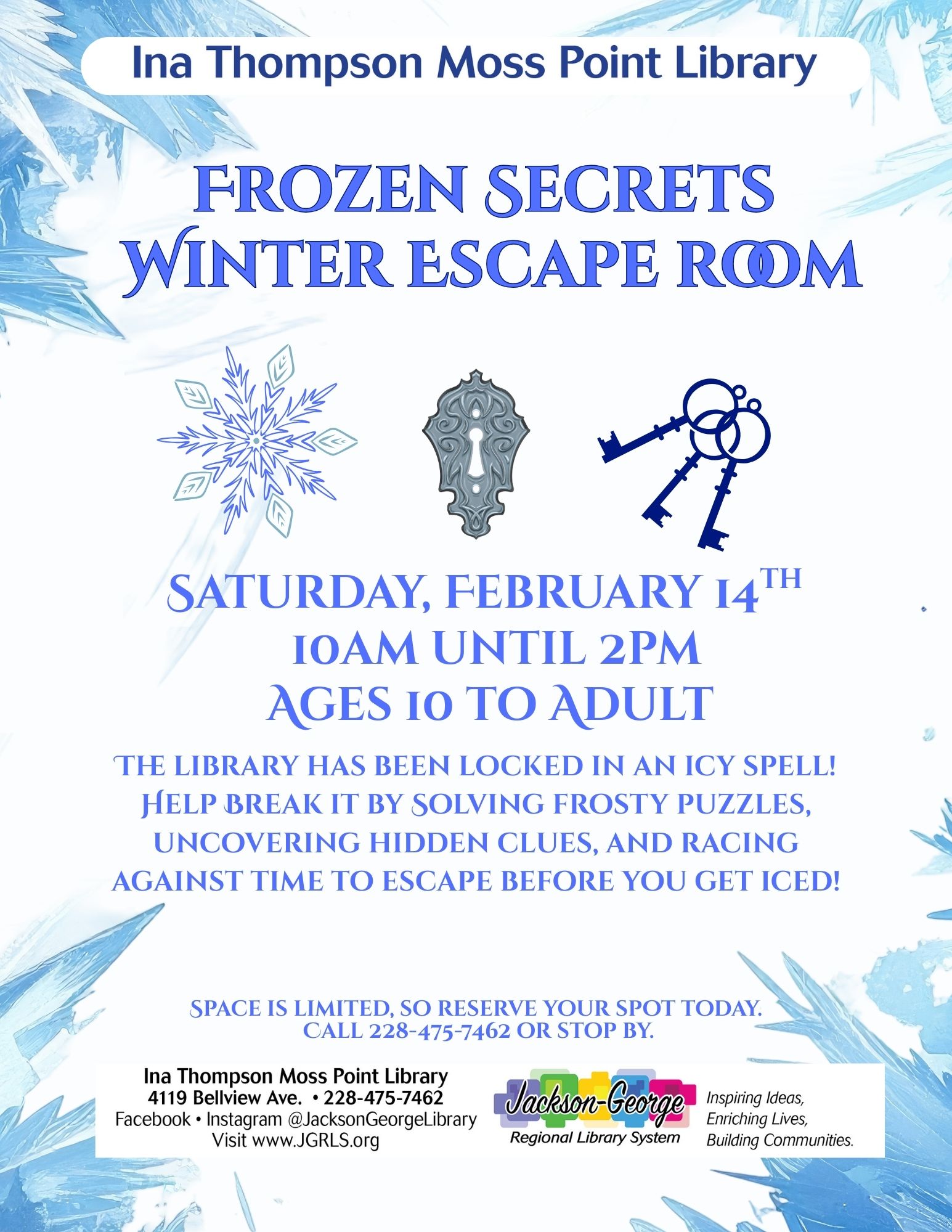 MOSS POINT, MS — Ina Thompson Moss Point Library invites the community to test their problem-solving skills at Frozen Secrets: Winter Escape Room on Saturday, February 14, from 10:00 a.m. to 2:00 p.m.