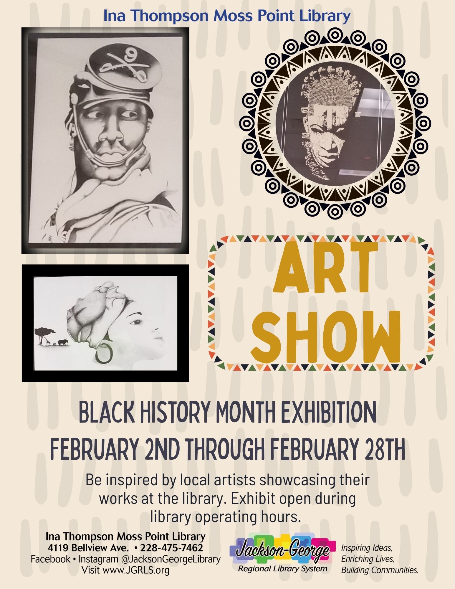 MOSS POINT, MS — The Ina Thompson Moss Point Library invites the community to experience a Black History Month Art Show featuring works by local artists, on display February 2 through February 28.
