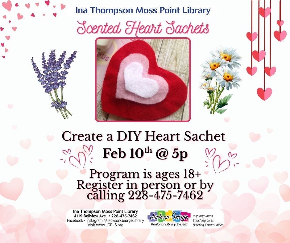 MOSS POINT, MS — Ina Thompson Moss Point Library invites adults to enjoy a creative evening at Scented Heart Sachets, a DIY craft program taking place on Monday, February 10 at 5:00 p.m.