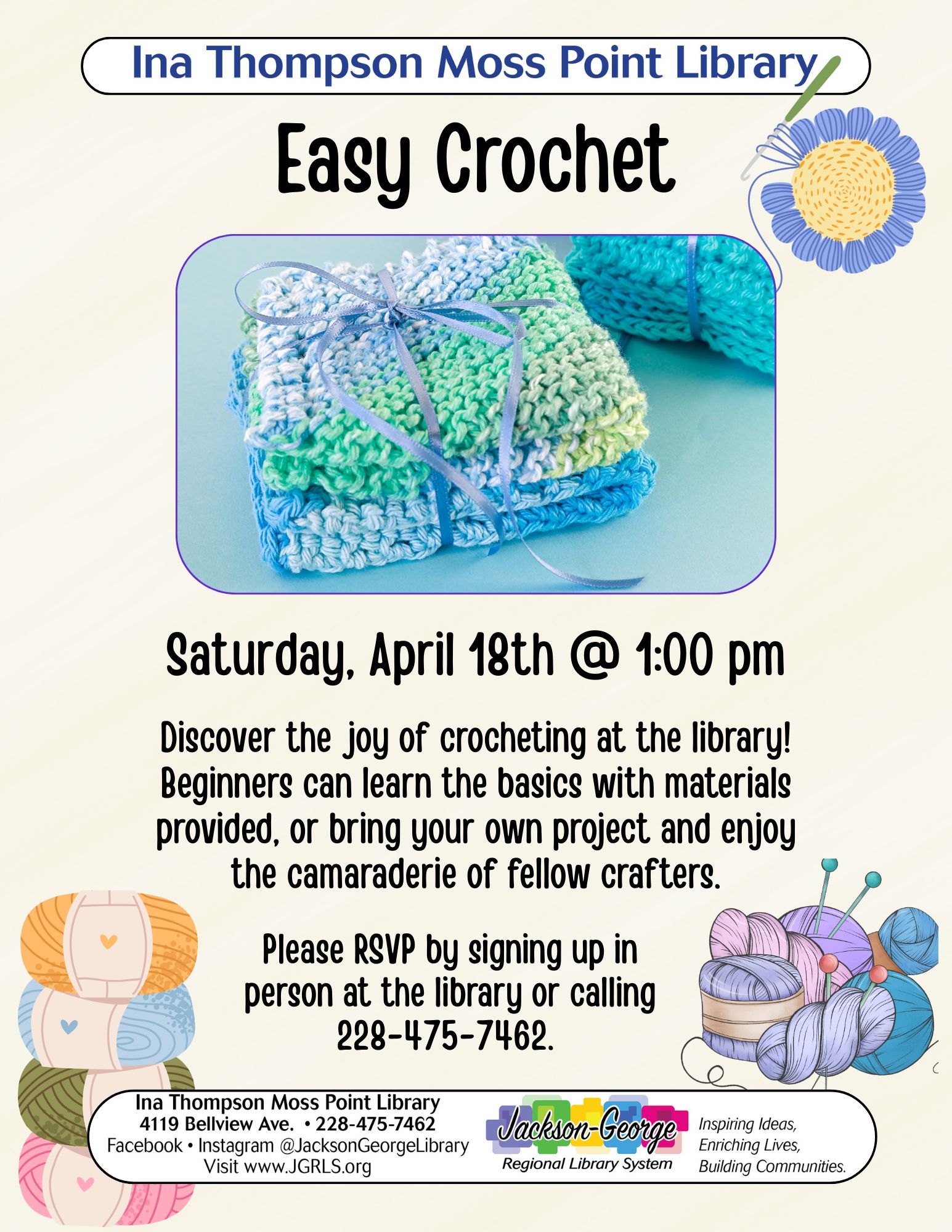 MOSS POINT, MS — Ina Thompson Moss Point Library invites community members to learn a new skill at its Easy Crochet Workshop on Saturday, April 18 at 1:00 p.m.