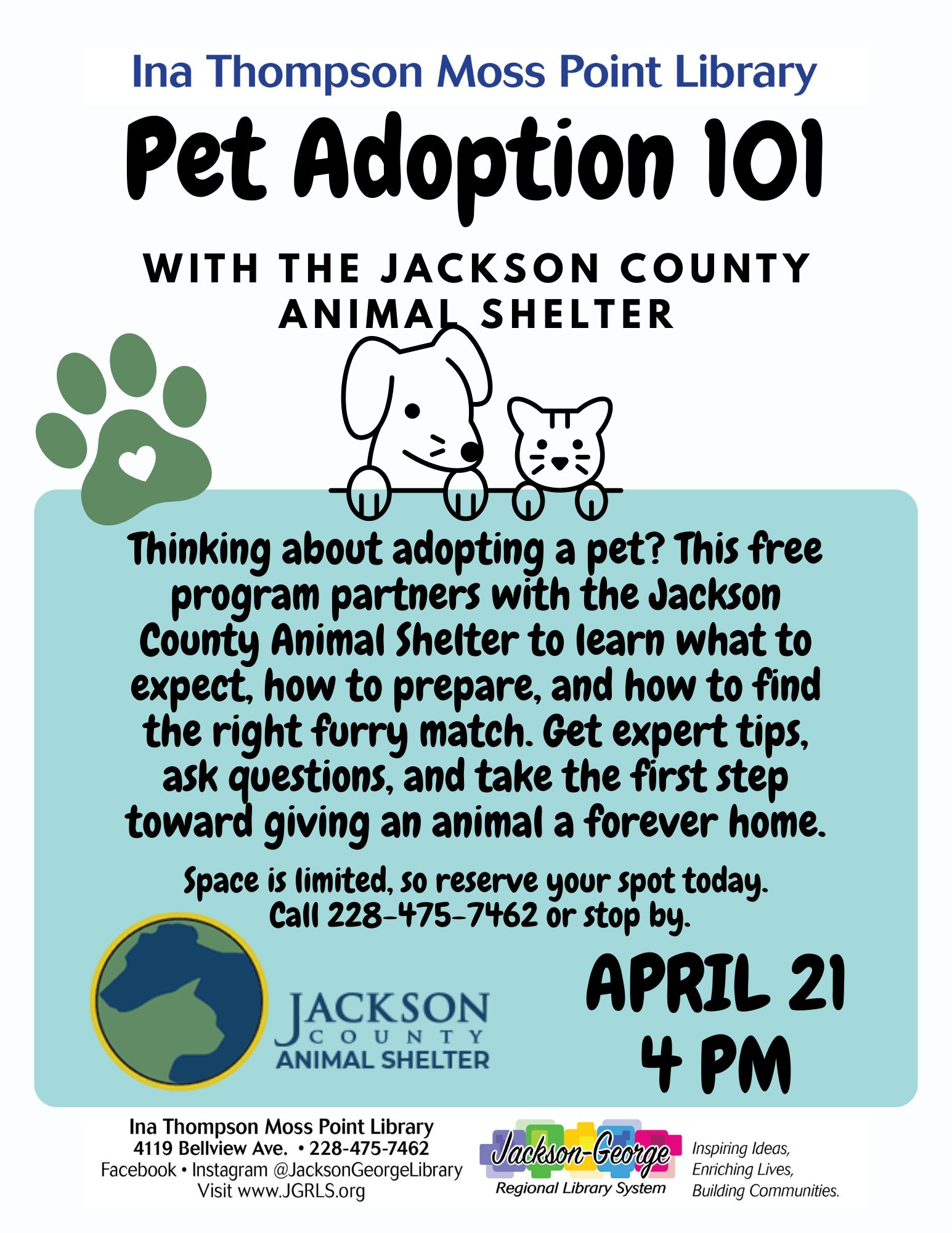 MOSS POINT, MS — Ina Thompson Moss Point Library invites the community to attend Pet Adoption 101, a free informational program presented in partnership with the Jackson County Animal Shelter, on Tuesday, April 21 at 4:00 p.m.
