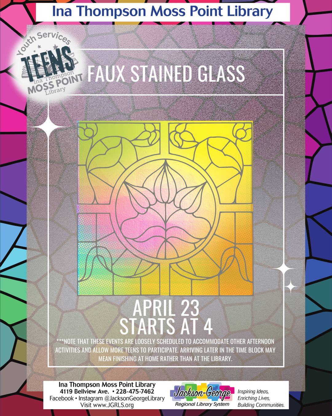 MOSS POINT, MS — Teens are invited to get creative at Ina Thompson Moss Point Library during a special Faux Stained Glass craft program on Thursday, April 23 beginning at 4:00 p.m.