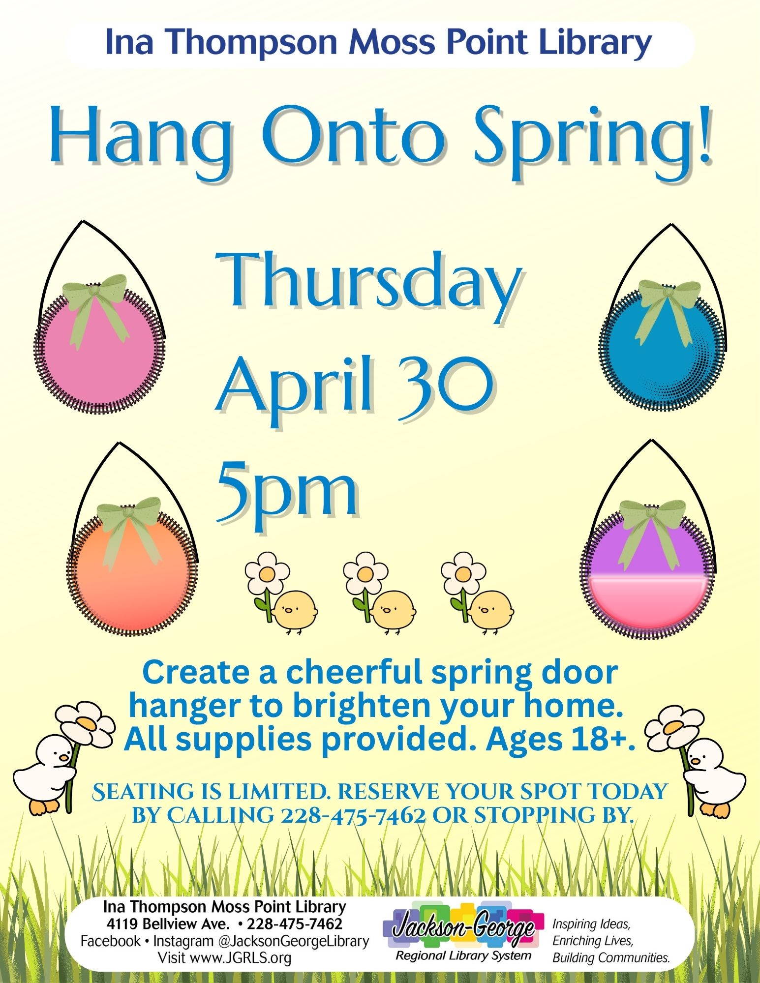MOSS POINT, MS — The Ina Thompson Moss Point Library invites the community to celebrate the season with its “Hang onto Spring!” craft program on Thursday, April 30 at 5:00 p.m.
