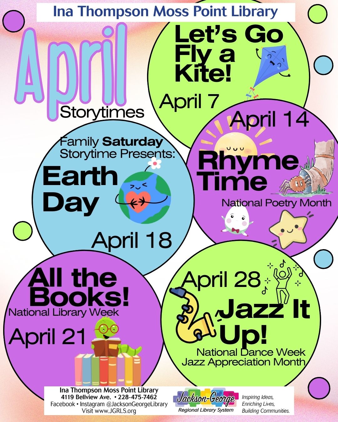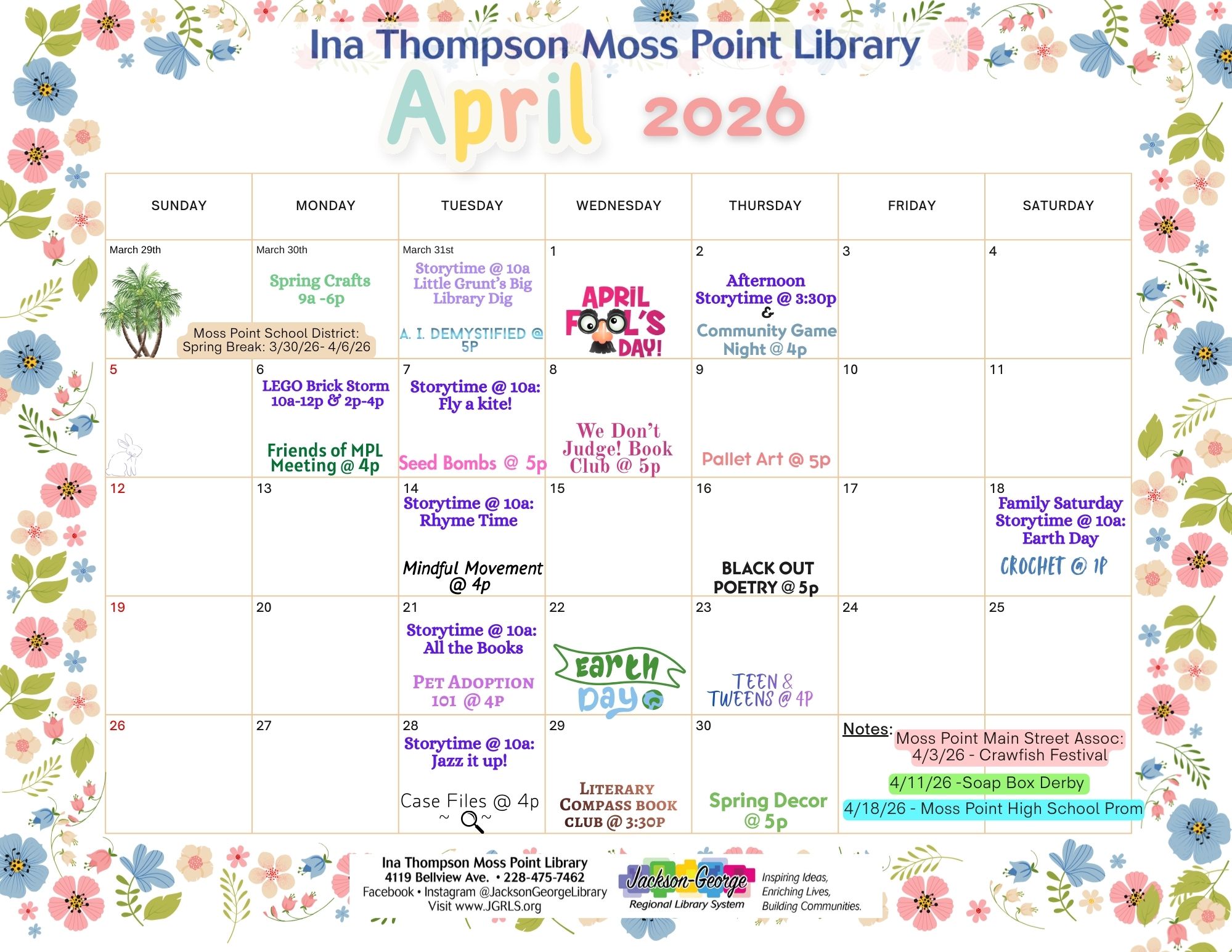 MOSS POINT, MS — Ina Thompson Moss Point Library invites families to join in the fun with a full month of themed April Storytimes designed to inspire imagination, creativity, and learning. Children and families can enjoy a variety of engaging programs throughout the month: