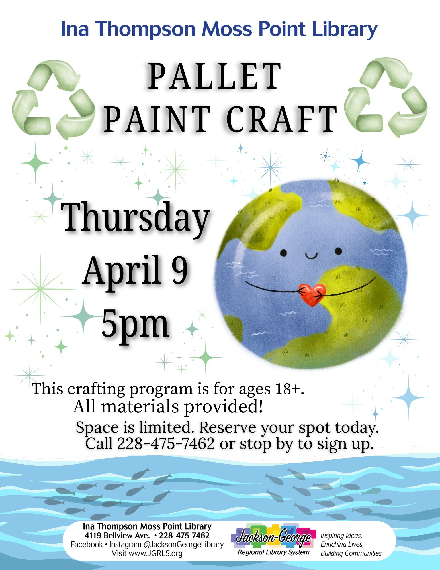 MOSS POINT, MS — Ina Thompson Moss Point Library invites adults to get creative and celebrate sustainability at the Pallet Paint Craft program on Thursday, April 9 at 5:00 p.m.