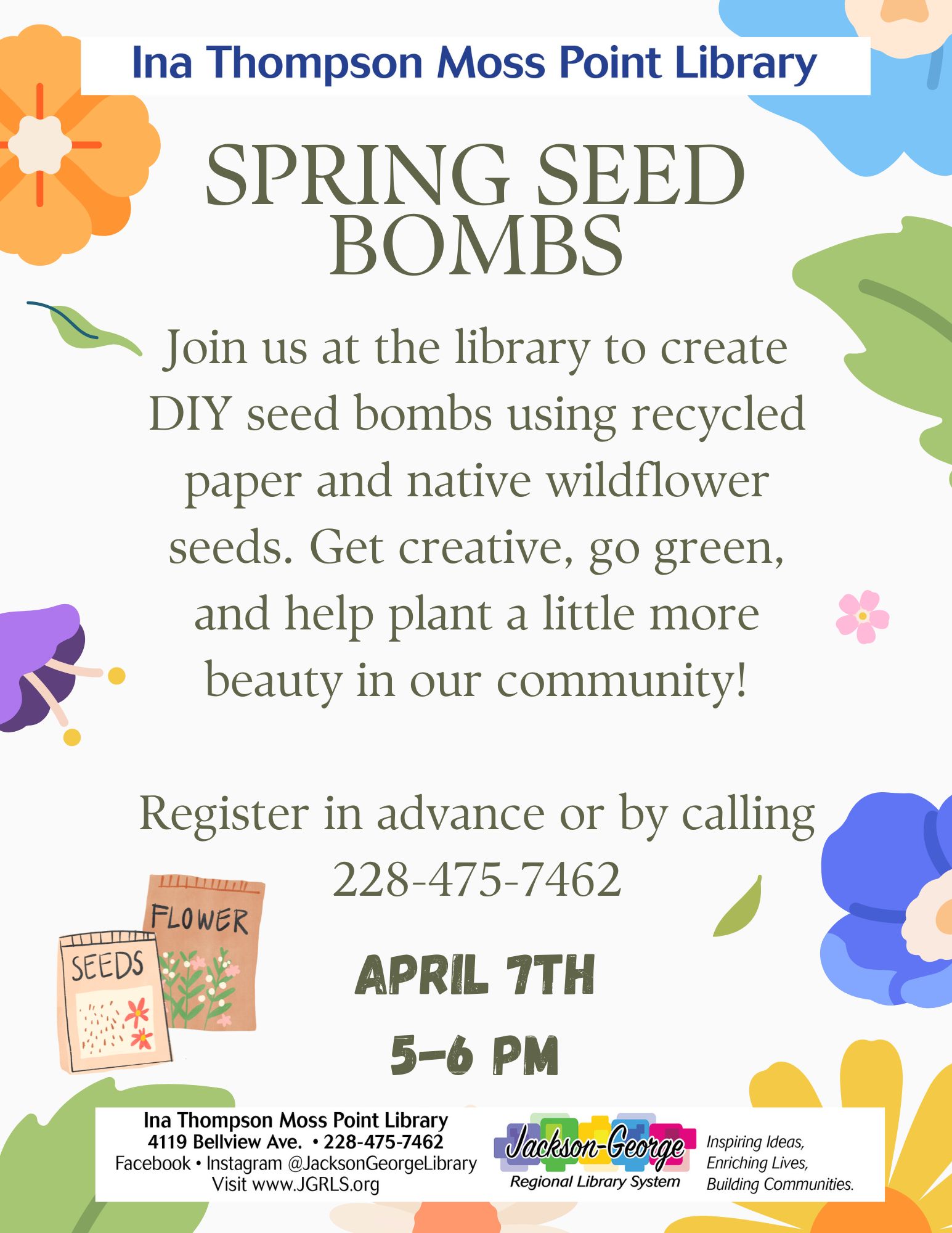 MOSS POINT, MS — Ina Thompson Moss Point Library invites the community to celebrate spring and support local pollinators at the Spring Seed Bombs Workshop on Tuesday, April 7 from 5:00 to 6:00 p.m.