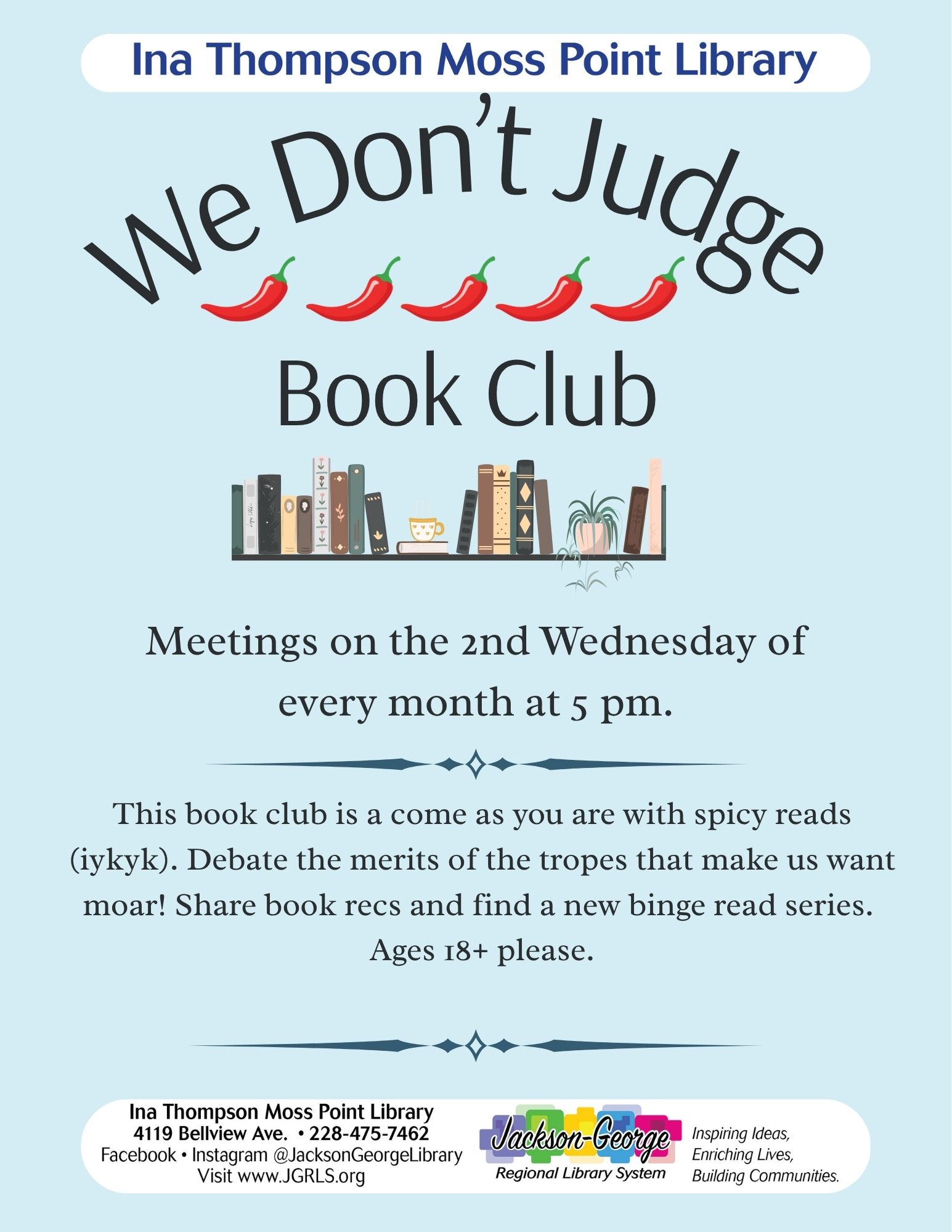 MOSS POINT, MS — The Ina Thompson Moss Point Library invites adult readers to join its new “We Don’t Judge” Book Club, a welcoming and lively space for open discussion and shared love of reading.