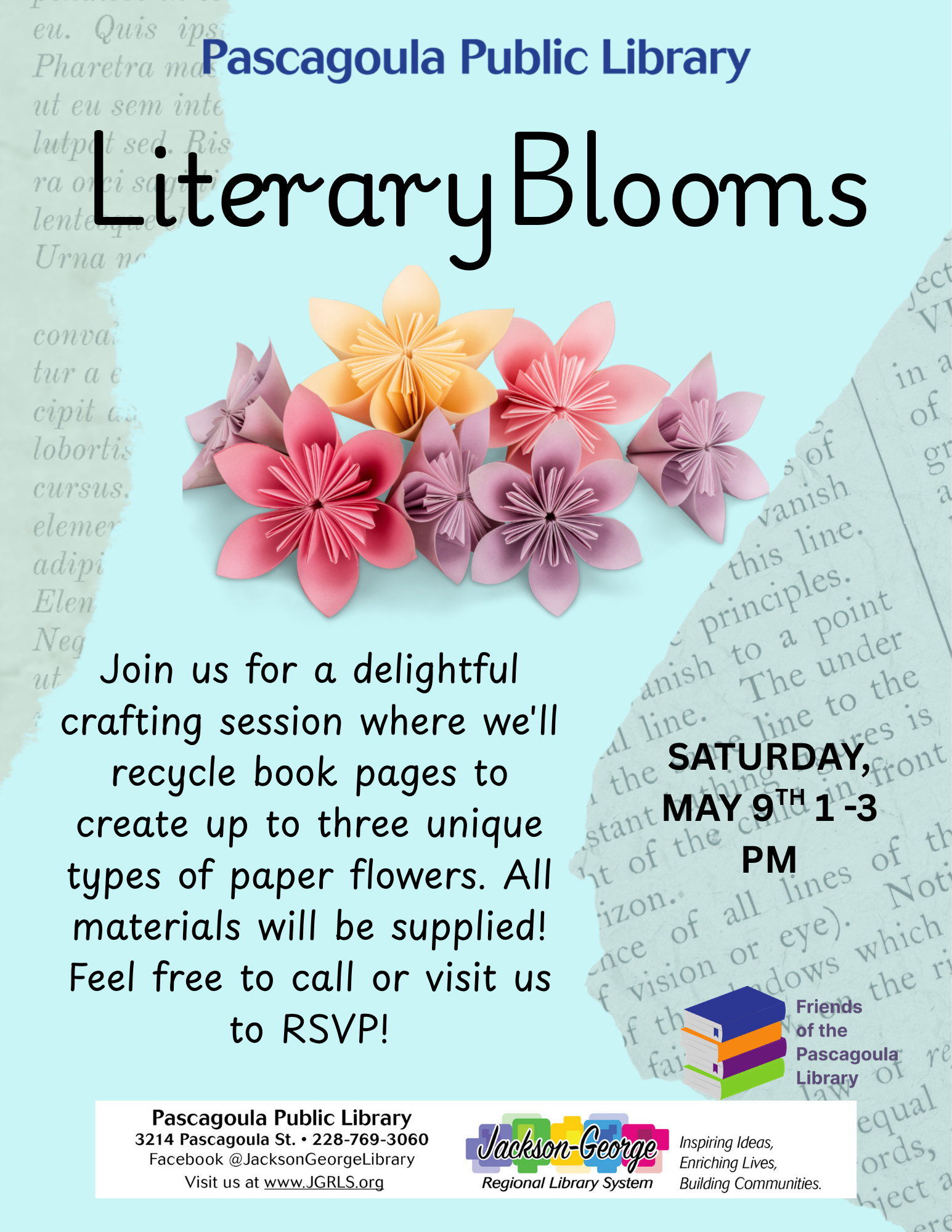 Pascagoula, MS — The Pascagoula Public Library invites the community to get creative at its upcoming “Literary Blooms” crafting session on Saturday, May 9 from 1:00–3:00 PM.