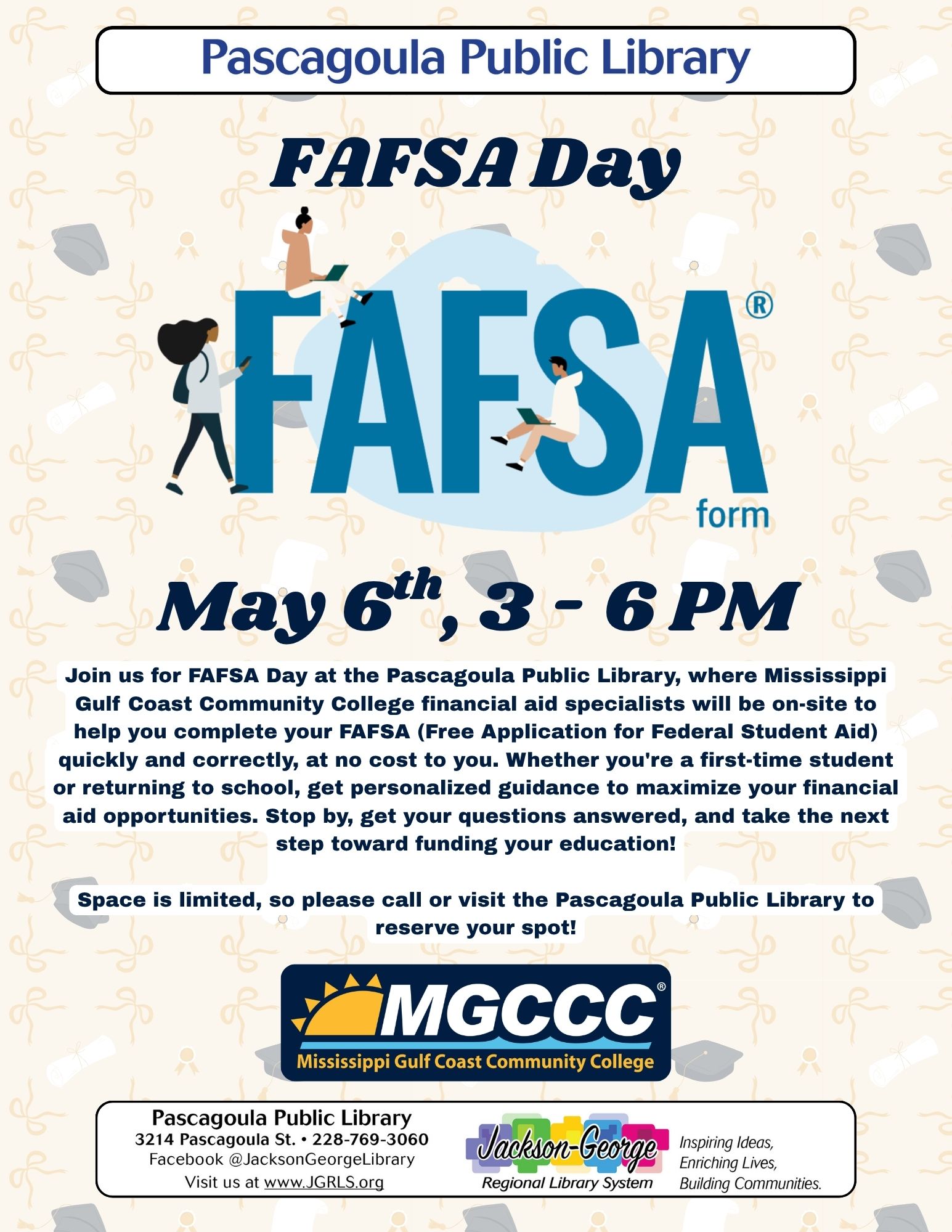 Pascagoula, MS — The Pascagoula Public Library is partnering with Mississippi Gulf Coast Community College to host FAFSA Day on May 6 from 3:00 to 6:00 PM, offering free, in-person assistance with completing the Free Application for Federal Student Aid (FAFSA).