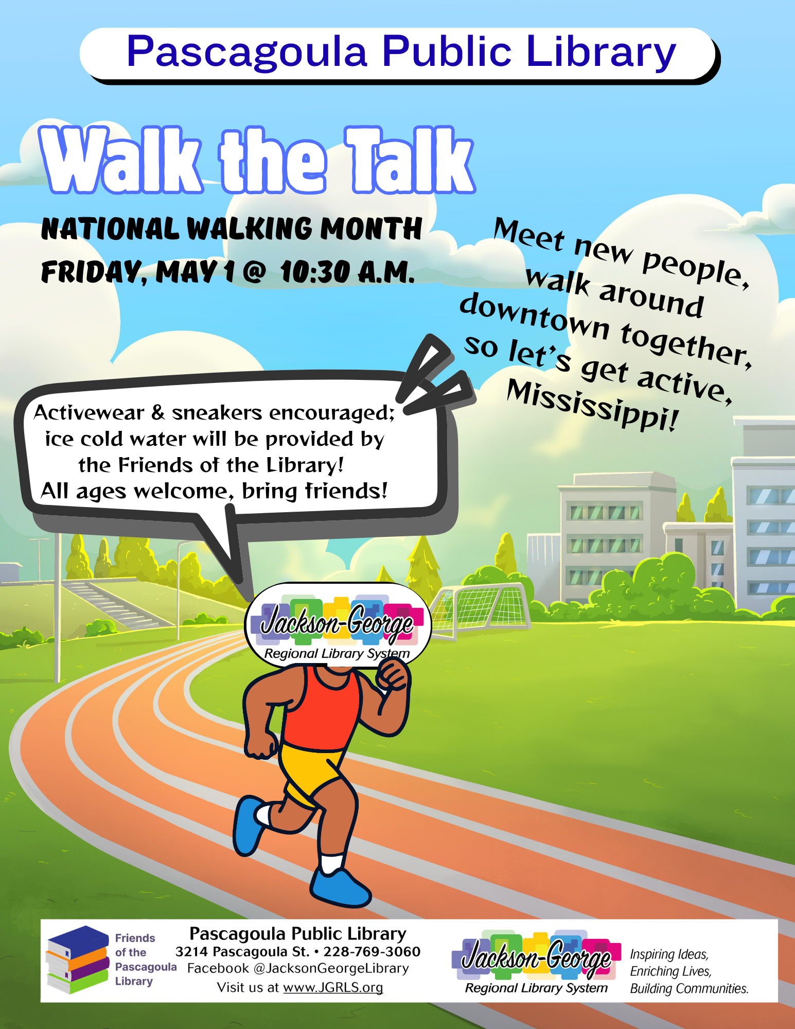 Pascagoula, MS — In celebration of National Walking Month, the Pascagoula Public Library invites the community to lace up their sneakers and join the “Walk the Talk” event on Friday, May 1 at 10:30 AM.