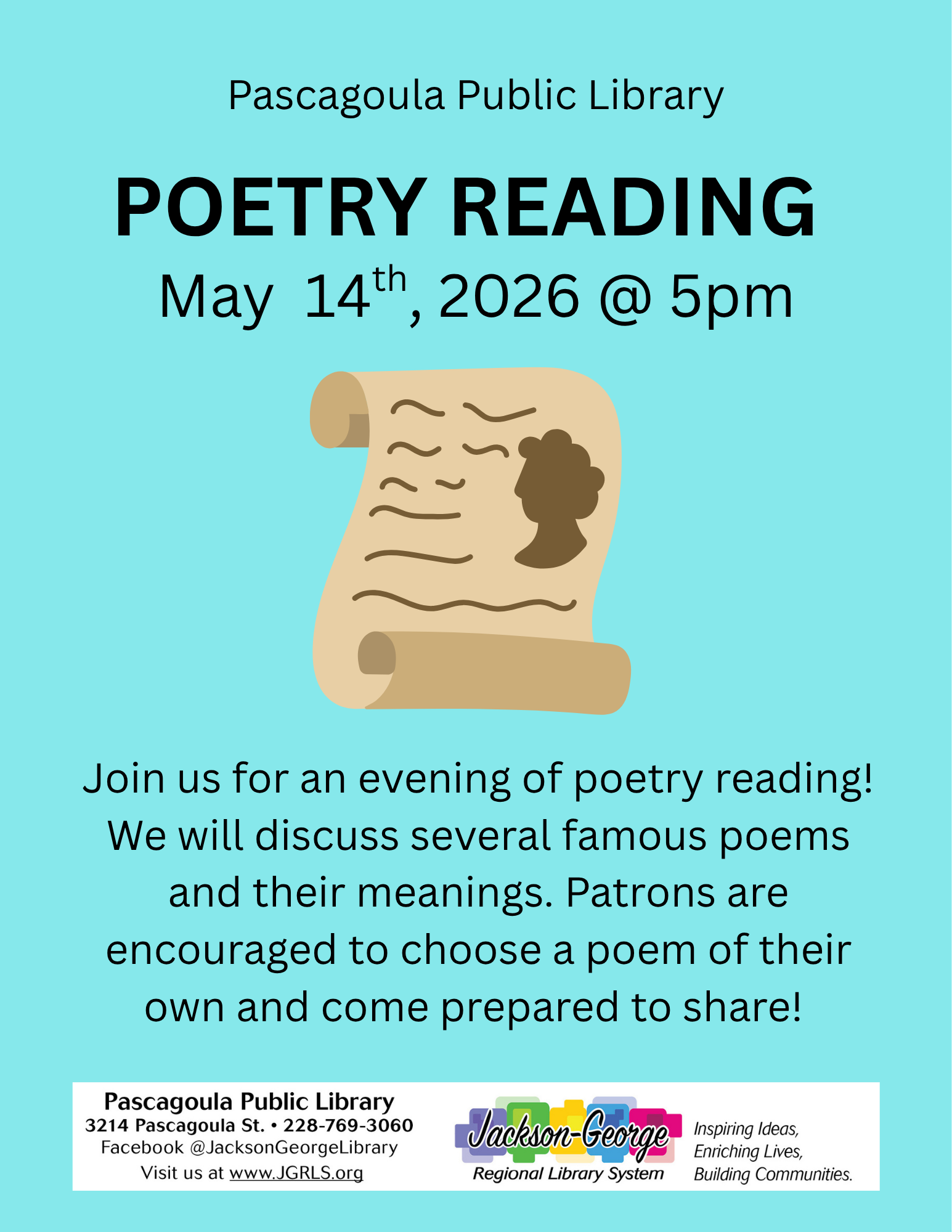 Pascagoula, MS — The Pascagoula Public Library invites poetry lovers and curious minds alike to an evening of creativity and conversation at its upcoming Poetry Reading on May 14, 2026, at 5:00 PM.