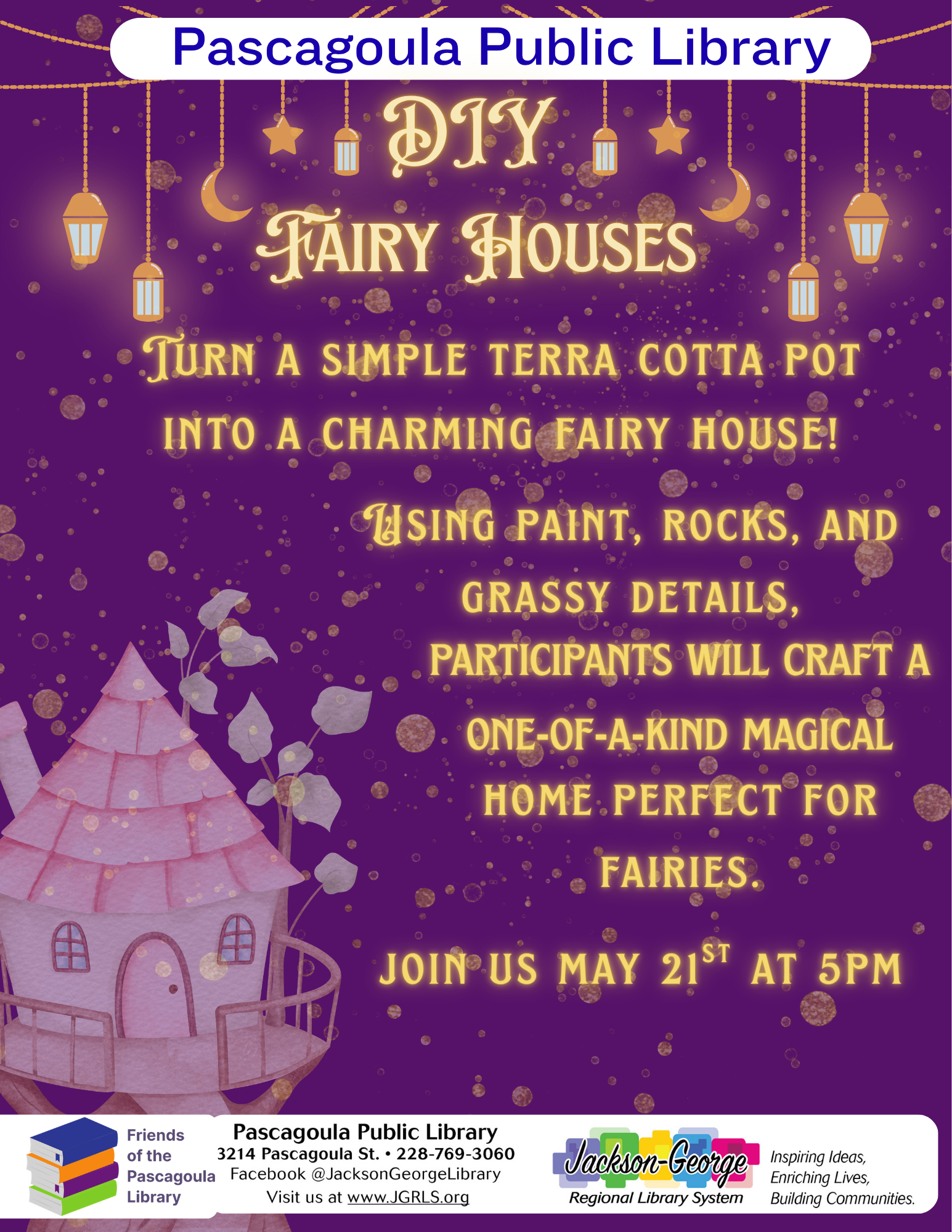 Pascagoula, MS — Let your imagination take flight at the Pascagoula Public Library’s upcoming DIY Fairy Houses program on Thursday, May 21 at 5:00 PM.