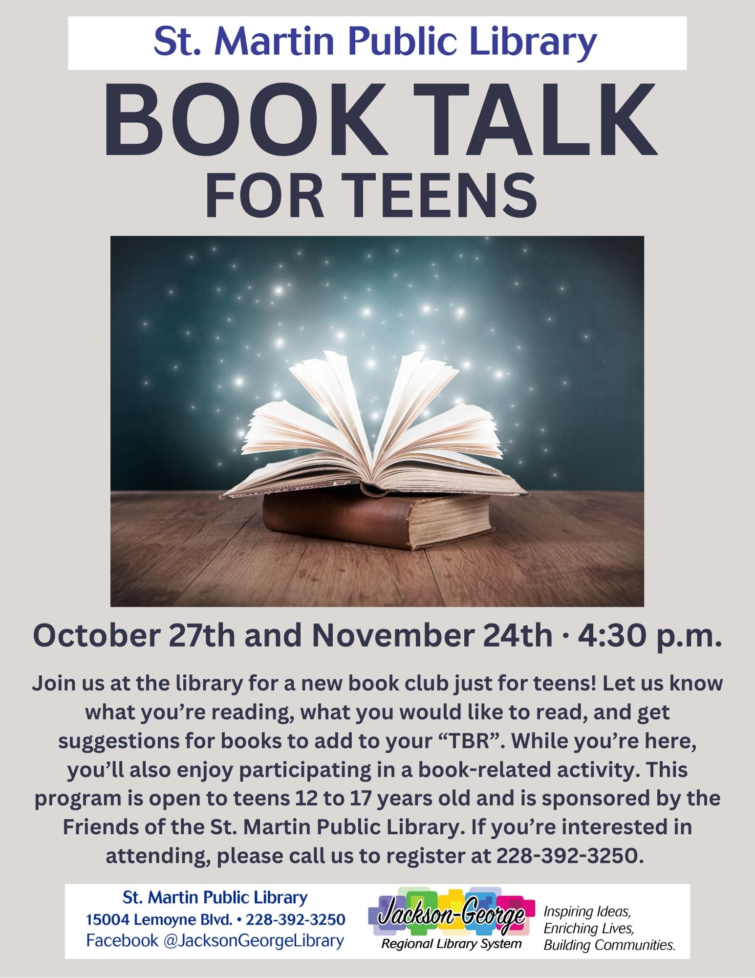 St. Martin, MS — The St. Martin Public Library invites teens aged 12–17 to its new Book Talk for Teens program on October 27 and November 24 at 4:30 PM. Participants can share what they’re reading, discover new books, and enjoy fun, book-related activities.