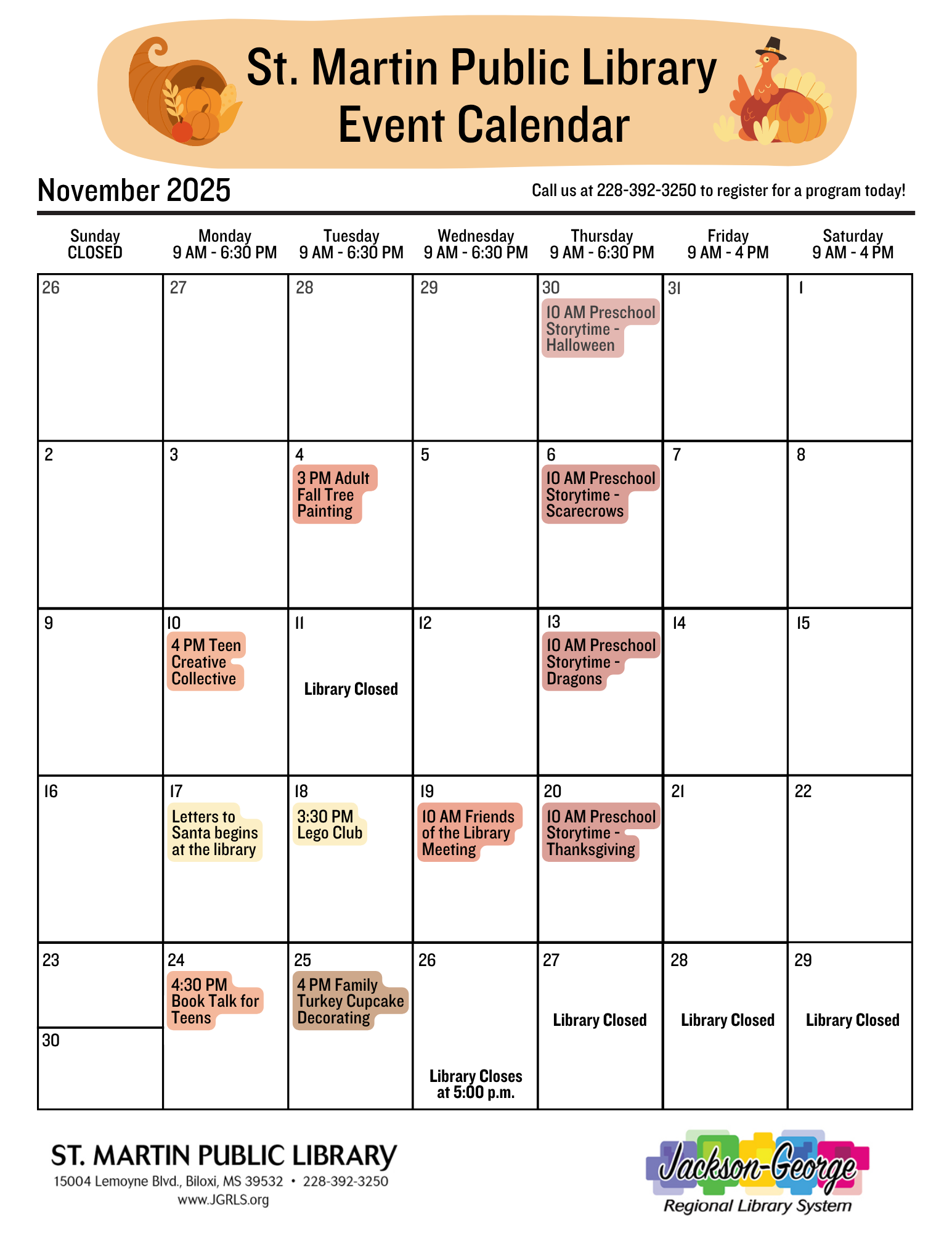 This program is sponsored by the Friends of the St. Martin Public Library. Registration is required—call 228-392-3250 to reserve your spot.