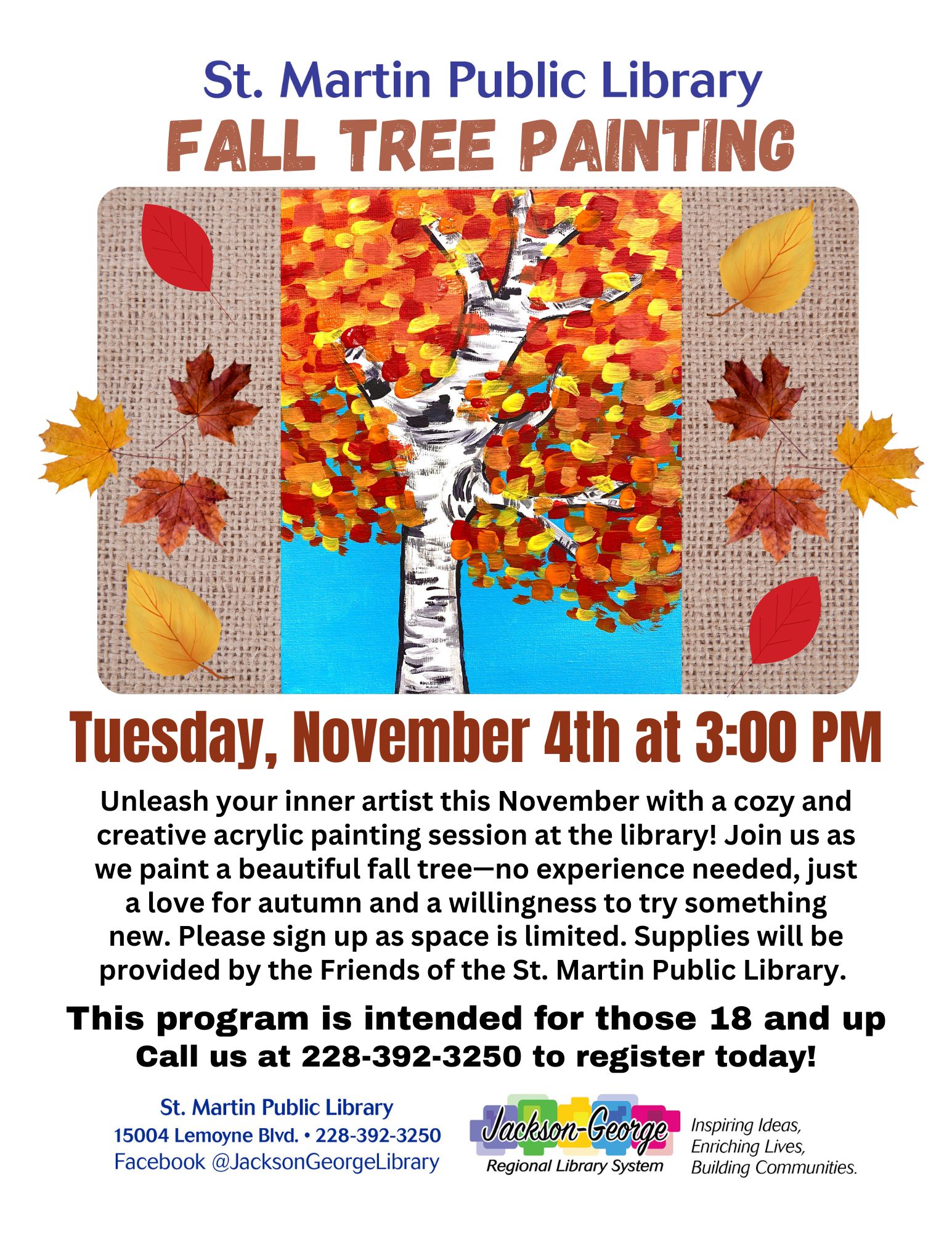 St. Martin, MS — St. Martin Public Library invites adults to embrace the beauty of autumn with a Fall Tree Painting session on Tuesday, November 4, at 3:00 p.m. Participants will enjoy a cozy afternoon of creativity while learning to paint a colorful fall tree using acrylics. No experience is required, just bring your love for the season and your willingness to try something new! All supplies will be provided courtesy of the Friends of the St. Martin Public Library. Space is limited, so participants are encouraged to register early.