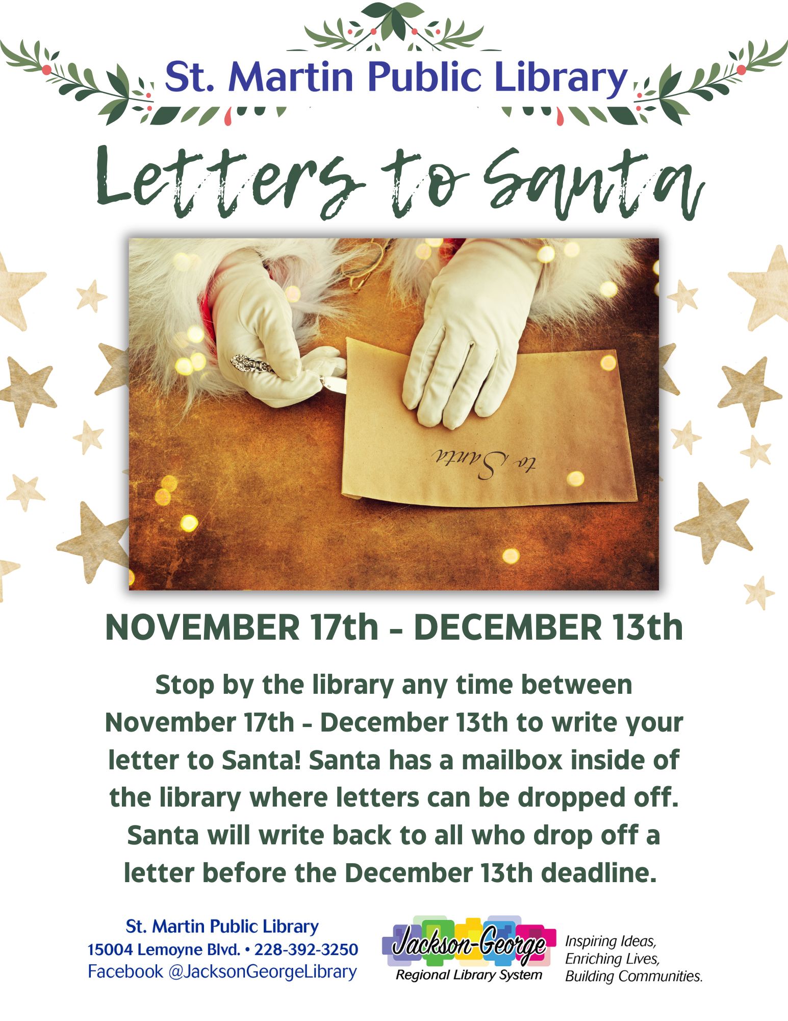 St. Martin, MS — The holiday spirit has arrived at St. Martin Public Library! From November 17 through December 13, children are invited to stop by the library anytime to write and send their Letters to Santa.