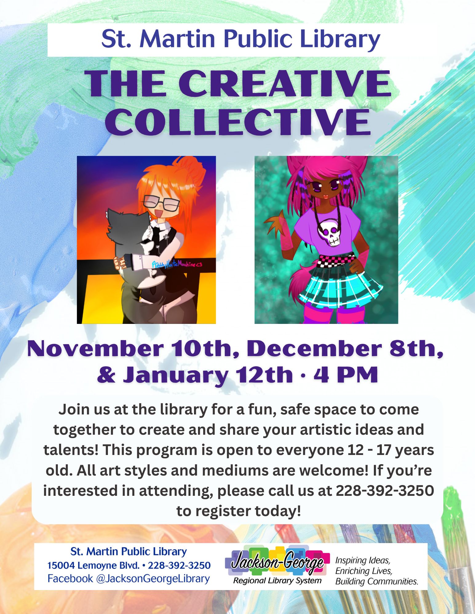 St. Martin, MS — St. Martin Public Library invites teens to join The Creative Collective, a welcoming and inspiring space for young artists to create, collaborate, and share their talents! Meetings will be held on November 10, December 8, and January 12 at 4:00 p.m. Each session offers a relaxed, judgment-free environment where teens ages 12–17 can explore their creativity across any art form, from drawing, painting, and poetry to music, digital art, and more.