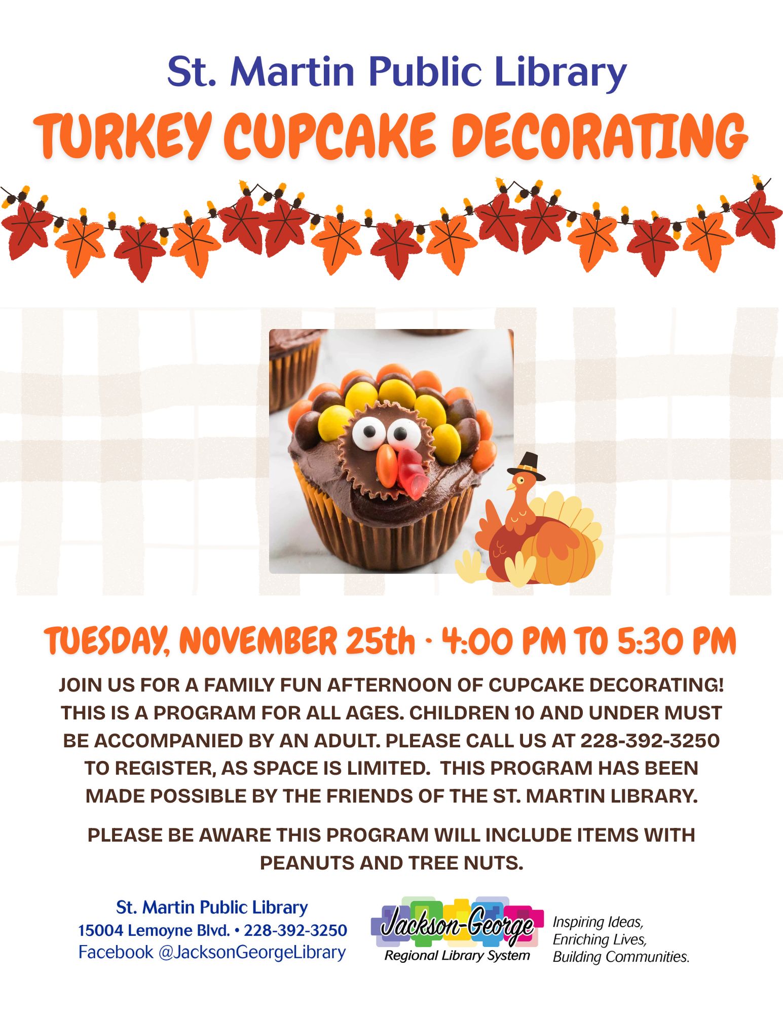 St. Martin Public Library invites families to join us for a sweet and festive afternoon of fun at our Turkey Cupcake Decorating event on Tuesday, November 25, from 4:00 to 5:30 p.m. This all-ages program is a perfect way to get into the Thanksgiving spirit while enjoying a hands-on, creative activity. Families will decorate their own turkey-themed cupcakes using a variety of toppings and frostings, no baking skills required, just enthusiasm and creativity!