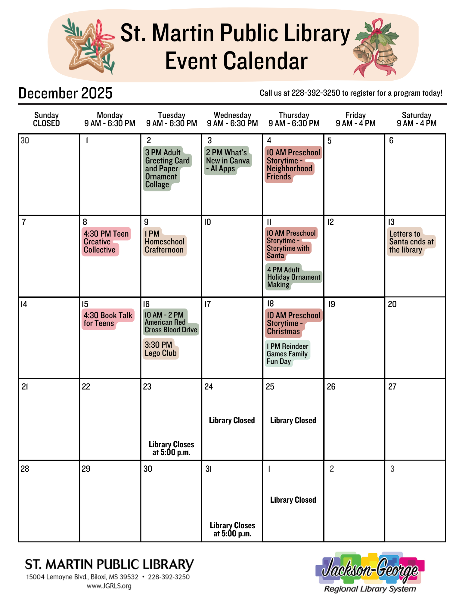 Space is limited, and registration is required. Supplies are generously provided by the Friends of the St. Martin Public Library. To reserve a spot, please call 228-392-3250.