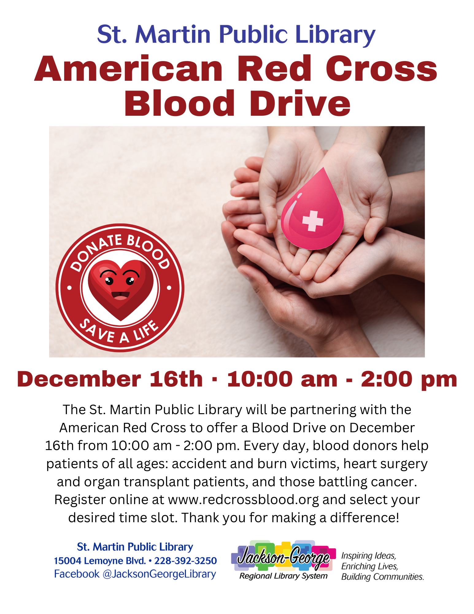 St. Martin, MS —The St. Martin Public Library is partnering with the American Red Cross to host a community Blood Drive on Monday, December 16, from 10:00 a.m. to 2:00 p.m.